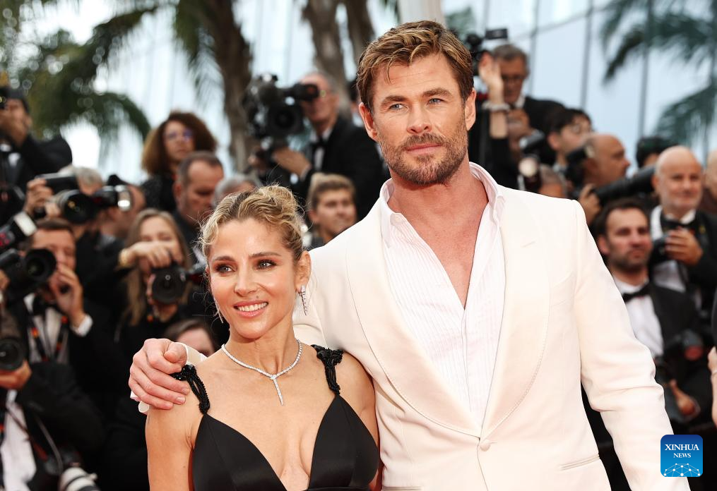 Actor Chris Hemsworth and actress Elsa Pataky arrive for the screening of the film "Furiosa: A Mad Max Saga" at the 77th edition of the Cannes Film Festival in Cannes, southern France, on May 15, 2024. (Xinhua/Gao Jing)