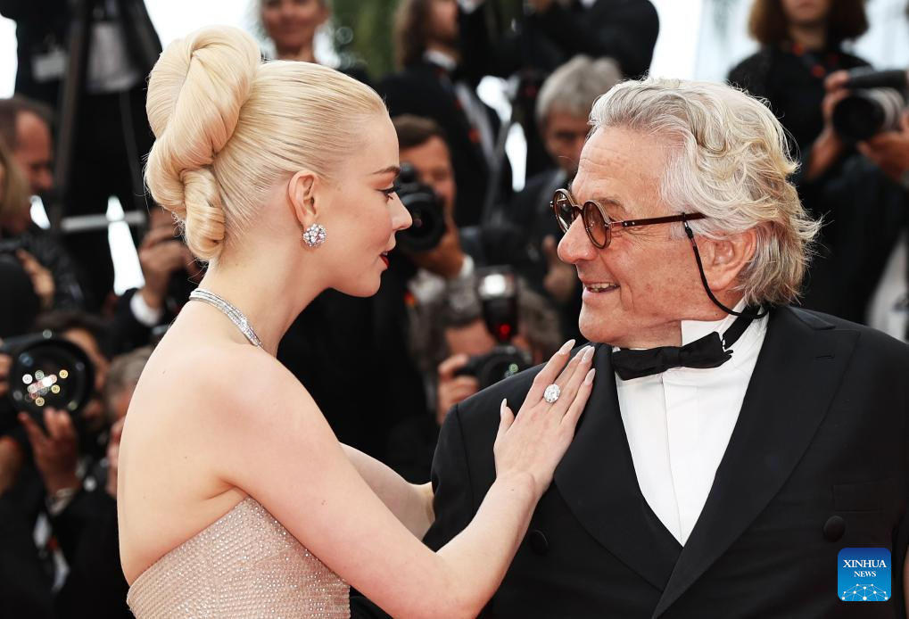 Actress Anya Taylor-Joy and director and screenwriter George Miller arrive for the screening of the film "Furiosa: A Mad Max Saga" at the 77th edition of the Cannes Film Festival in Cannes, southern France, on May 15, 2024. (Xinhua/Gao Jing)