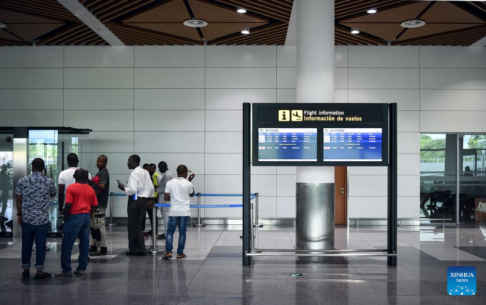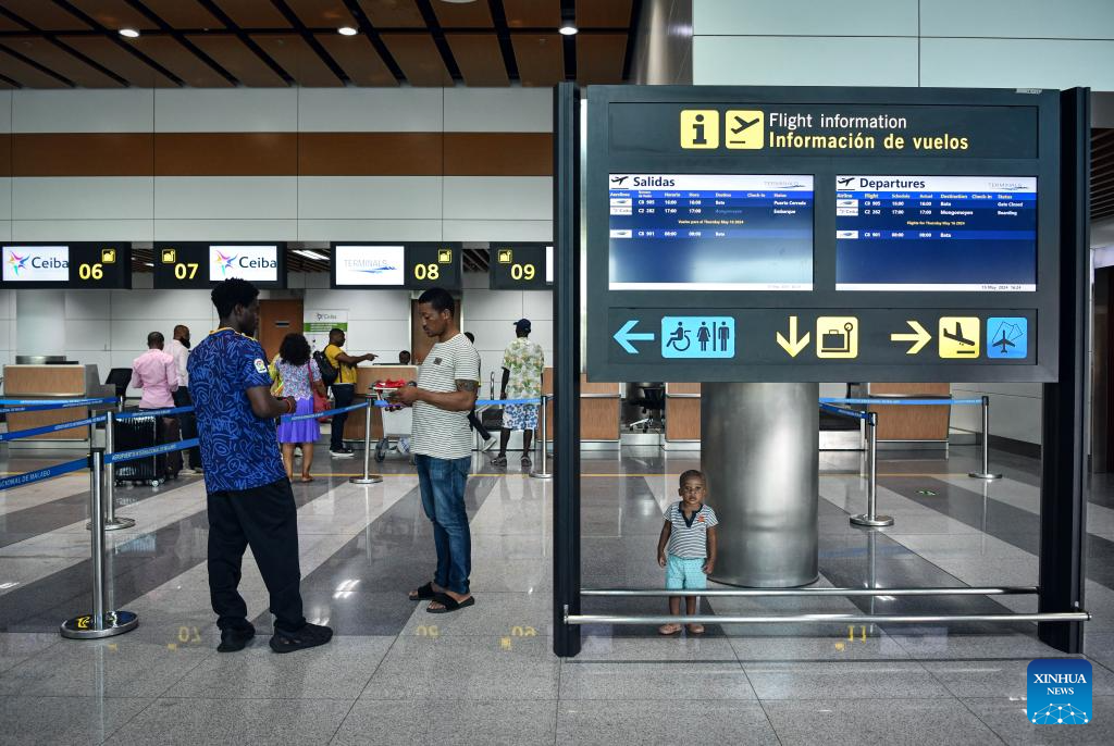 People check in at Malabo International Airport in Equatorial Guinea, on May 15, 2024. The new terminal project of Malabo International Airport, constructed by Weihai International Economic & Technical Cooperative Co., Ltd., turned operational in March 2023. Designed and built entirely according to Chinese standards, the project has a total construction area of approximately 45,000 square meters, capable of take-off and landing services for various types of civil aviation aircraft worldwide. (Xinhua/Han Xu)