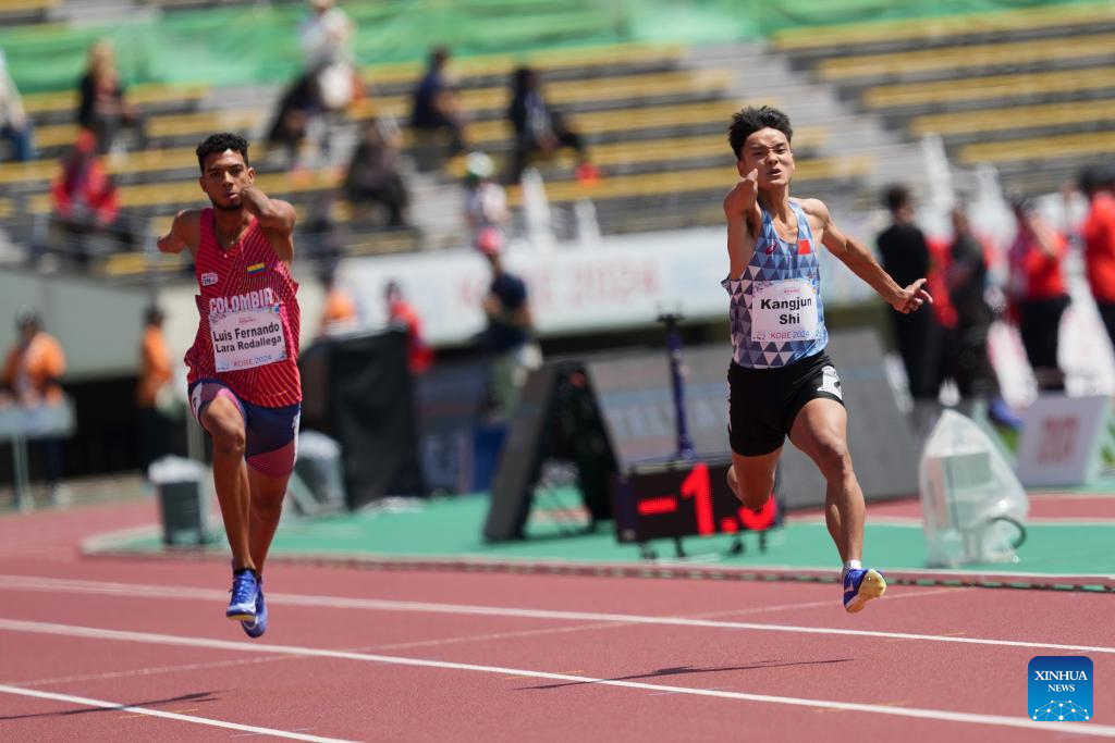 Shi Kangjun (R) of China competes during Men's 100m T47 Round 1 at the Para Athletics World Championships held in Kobe, Japan, on May 17, 2024. (Xinhua/Zhang Xiaoyu)