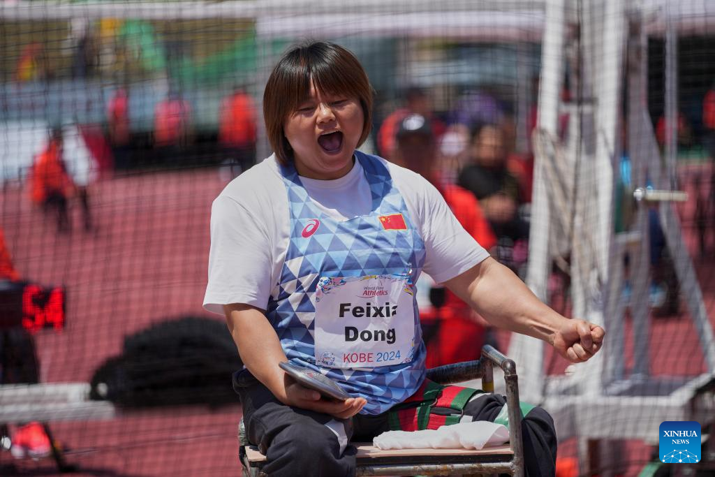 Dong Feixia of China reacts during Women's Discus Throw F55 Final at the Para Athletics World Championships held in Kobe, Japan, on May 17, 2024. (Xinhua/Zhang Xiaoyu)