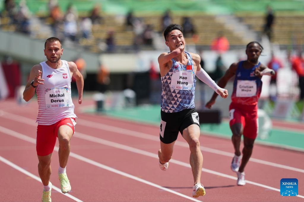 Wang Hao (C) of China competes during Men's 100m T47 Round 1 at the Para Athletics World Championships held in Kobe, Japan, on May 17, 2024. (Xinhua/Zhang Xiaoyu)