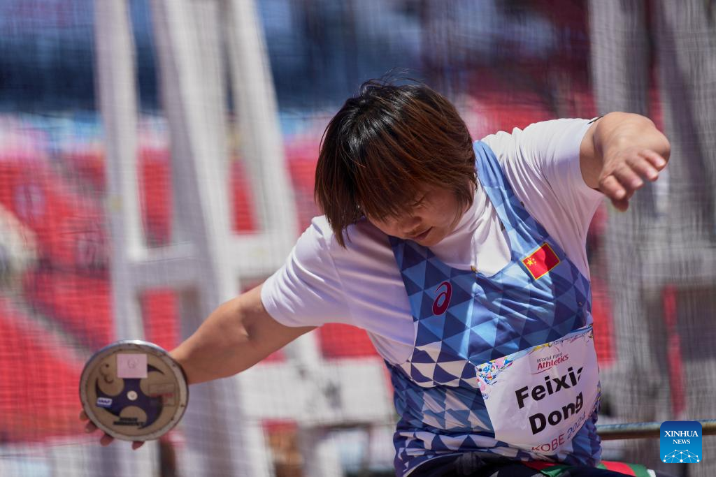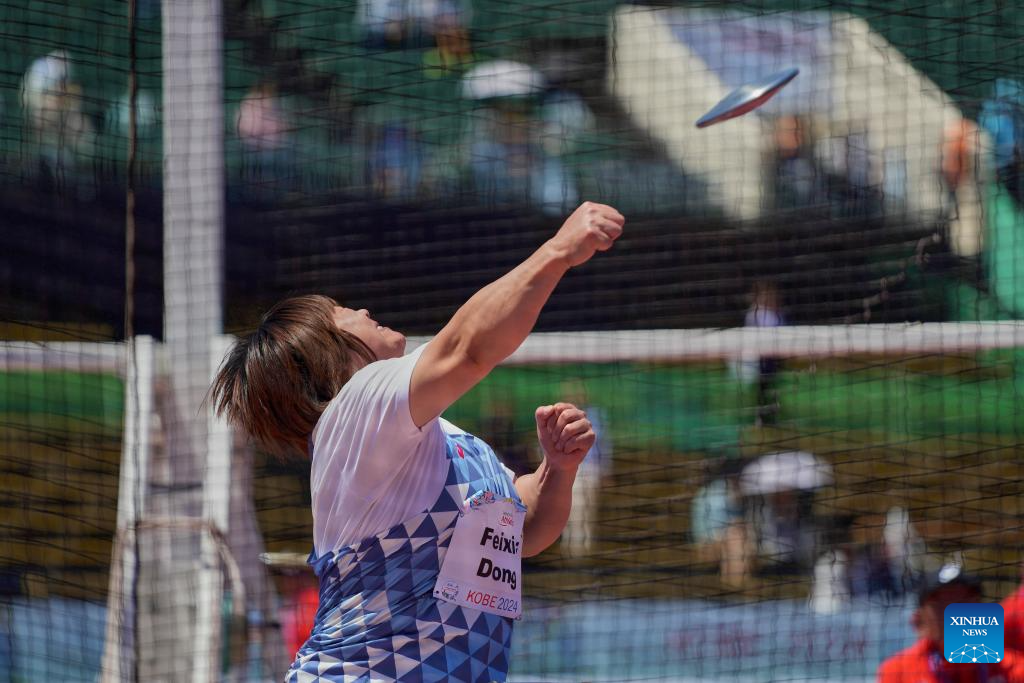 Dong Feixia of China competes during Women's Discus Throw F55 Final at the Para Athletics World Championships held in Kobe, Japan, on May 17, 2024. (Xinhua/Zhang Xiaoyu)