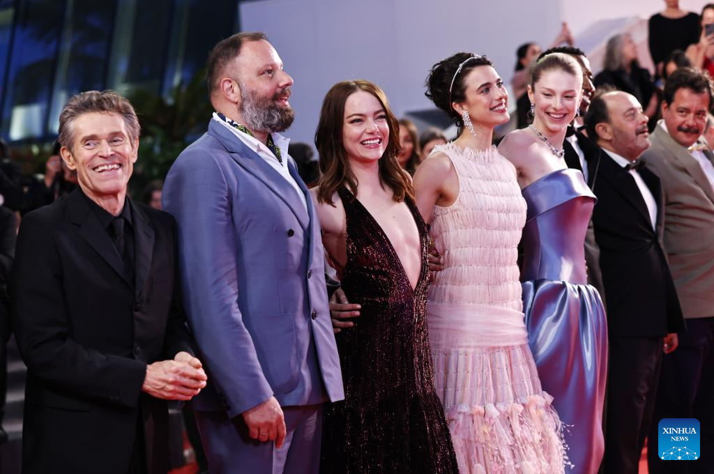 U.S. actress Emma Stone (C) leaves with fellow cast members after the screening of the film "Kinds of Kindness" at the 77th edition of the Cannes Film Festival in Cannes, southern France, on May 17, 2024. (Xinhua/Gao Jing)
