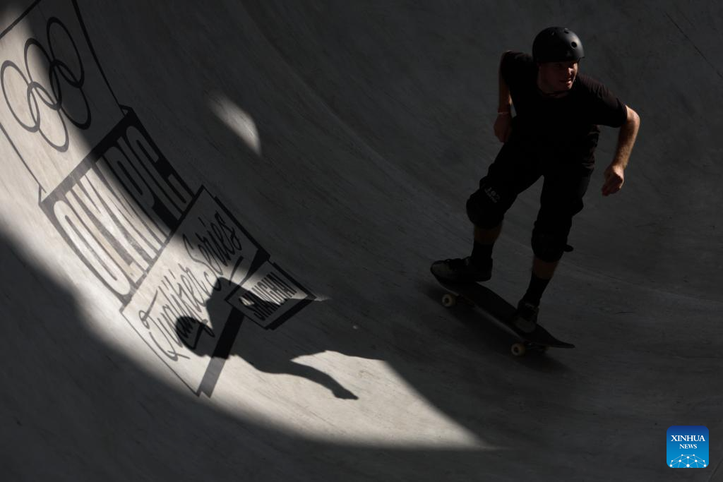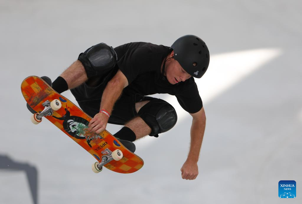 Taylor Nye of the United States competes during the men's park preliminaries of skateboarding at the Olympic Qualifier Series Shanghai in east China's Shanghai, May 17, 2024. (Xinhua/Wang Kaiyan)
