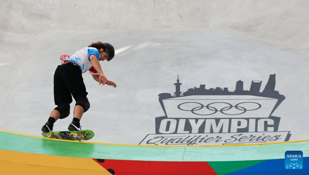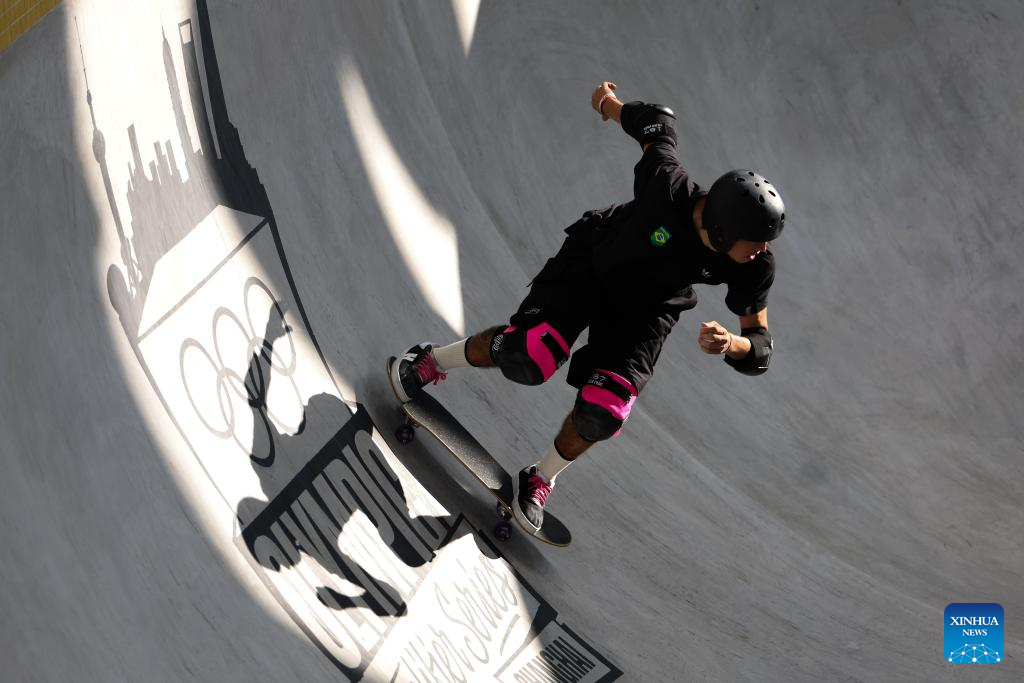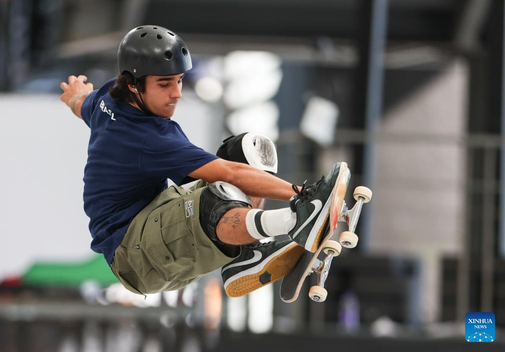 Pedro Quintas of Brazil competes during the men's park preliminaries of skateboarding at the Olympic Qualifier Series Shanghai in east China's Shanghai, May 17, 2024. (Xinhua/Wang Kaiyan)