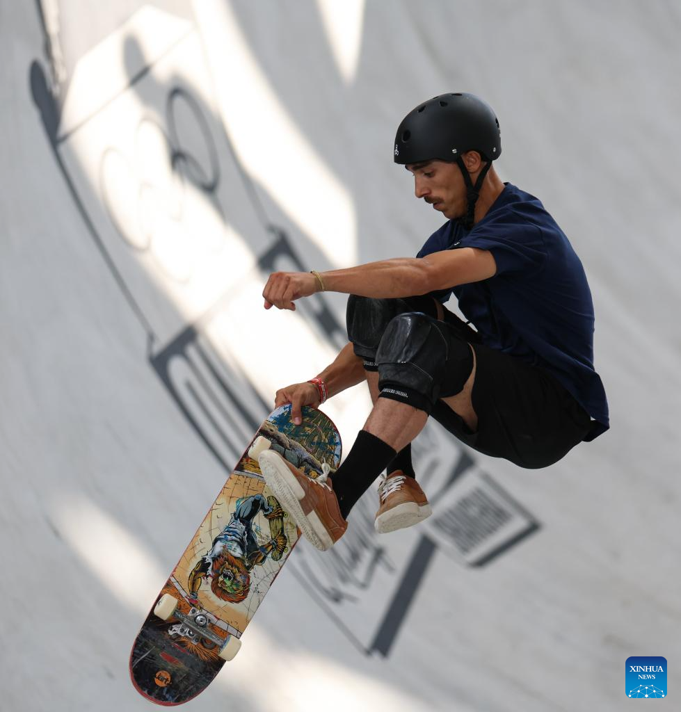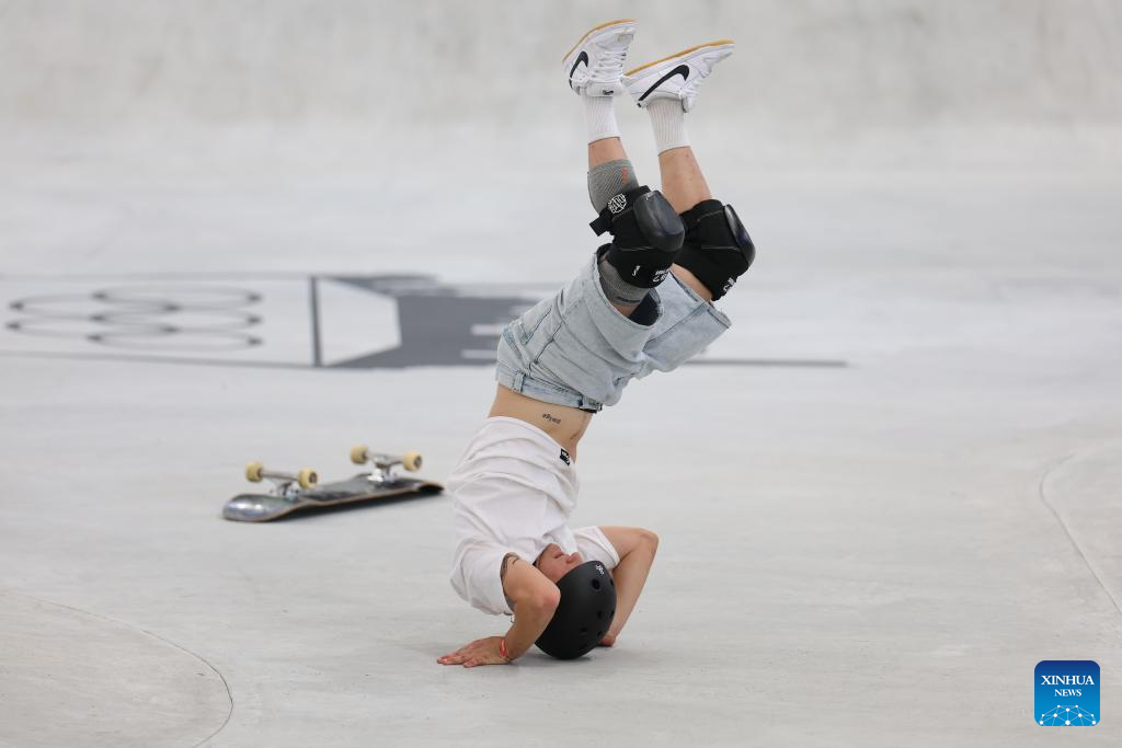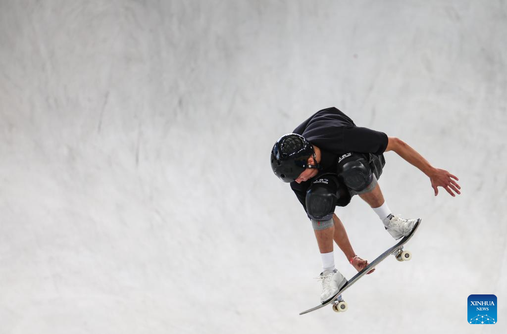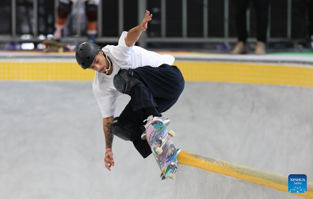 Augusto Akio of Brazil competes during the men's park preliminaries of skateboarding at the Olympic Qualifier Series Shanghai in east China's Shanghai, May 17, 2024. (Xinhua/Wang Kaiyan)