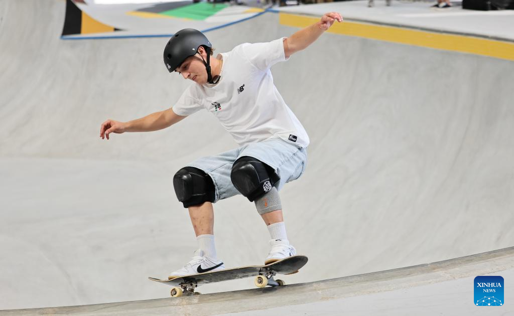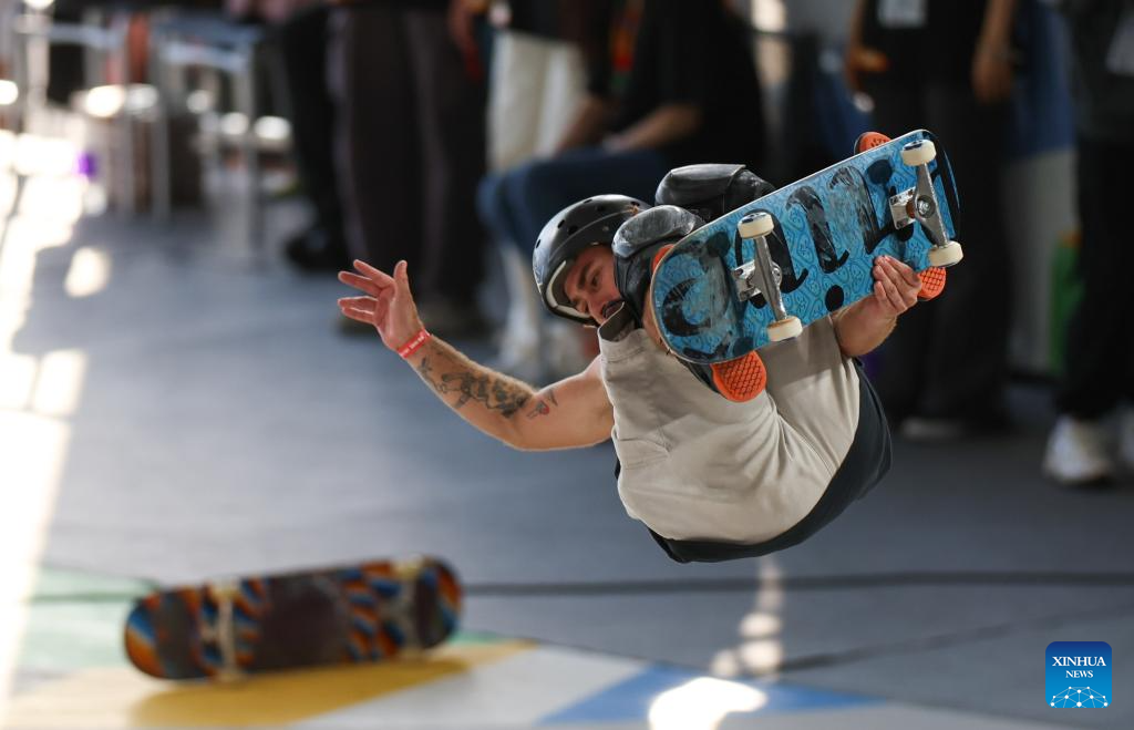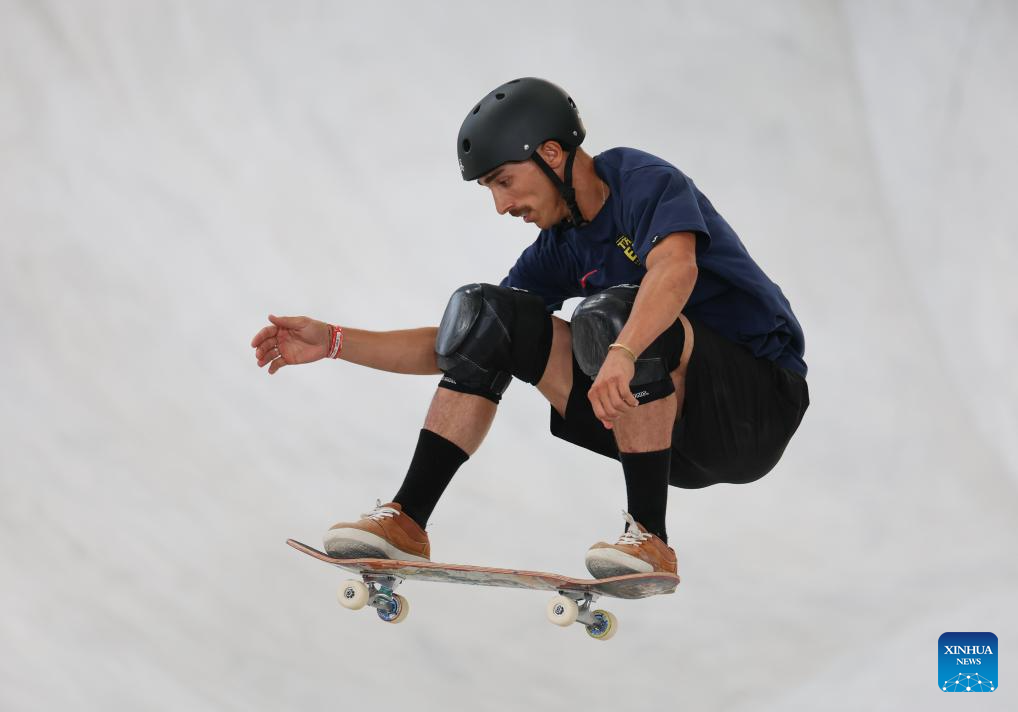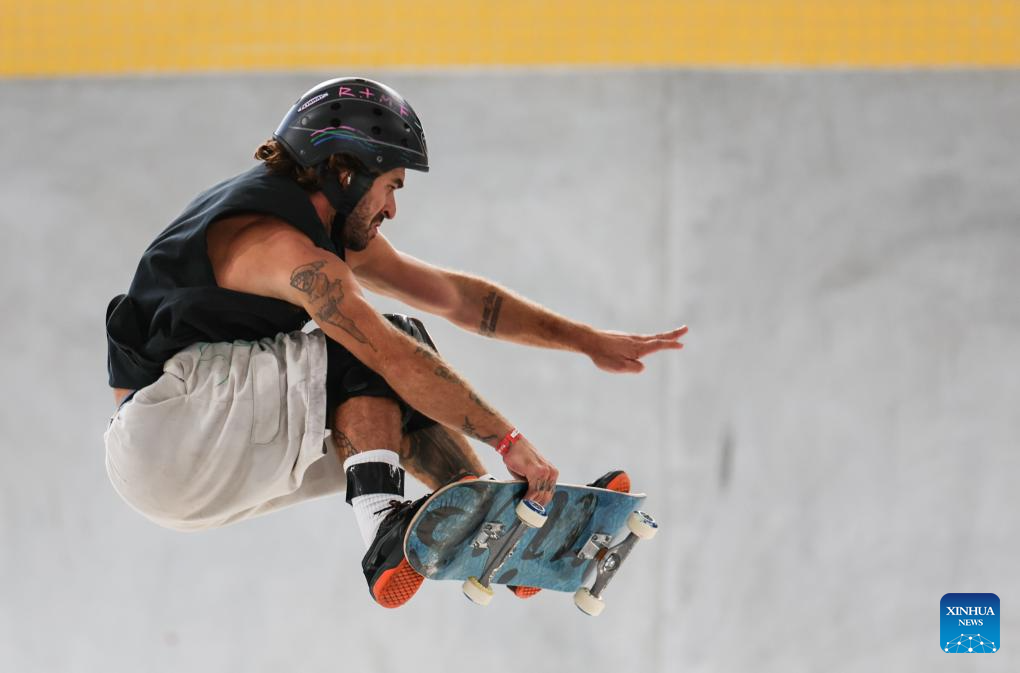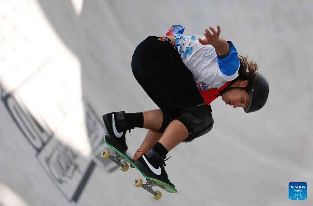 Pedro Barros of Brazil competes during the men's park preliminaries of skateboarding at the Olympic Qualifier Series Shanghai in east China's Shanghai, May 17, 2024. (Xinhua/Wang Kaiyan)