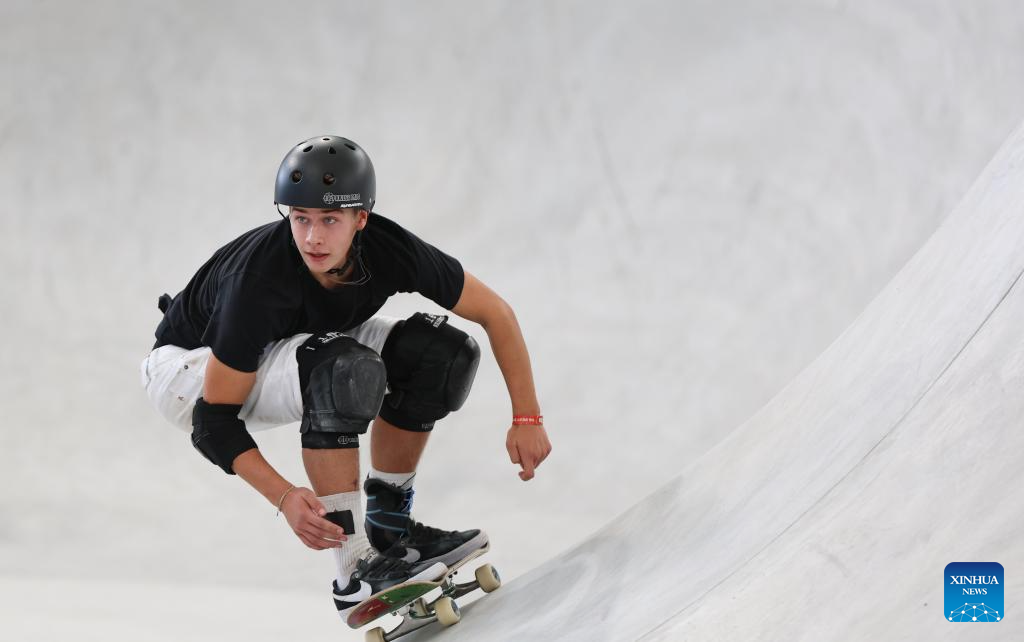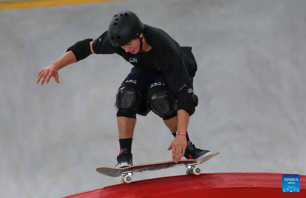 Luigi Cini of Brazil competes during the men's park preliminaries of skateboarding at the Olympic Qualifier Series Shanghai in east China's Shanghai, May 17, 2024. (Xinhua/Wang Kaiyan)