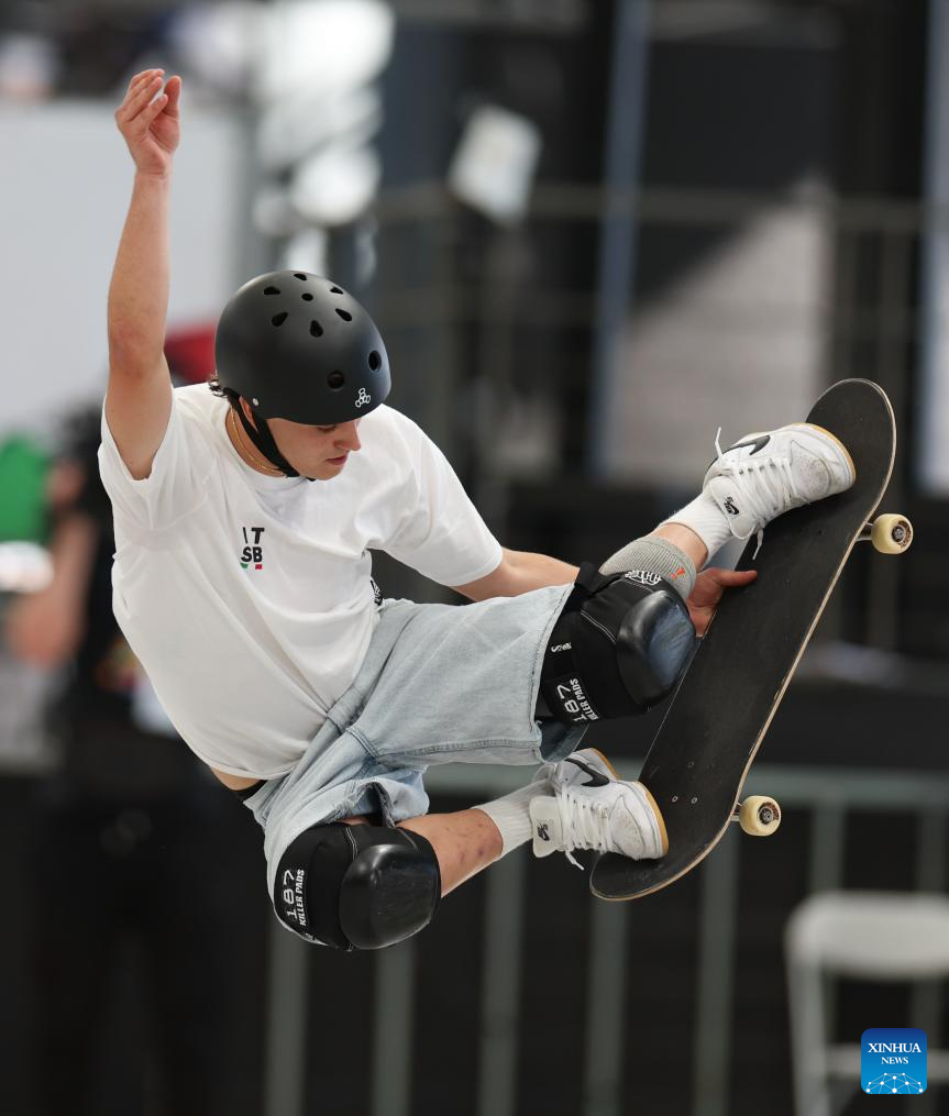 Alessandro Mazzara of Italy competes during the men's park preliminaries of skateboarding at the Olympic Qualifier Series Shanghai in east China's Shanghai, May 17, 2024. (Xinhua/Wang Kaiyan)