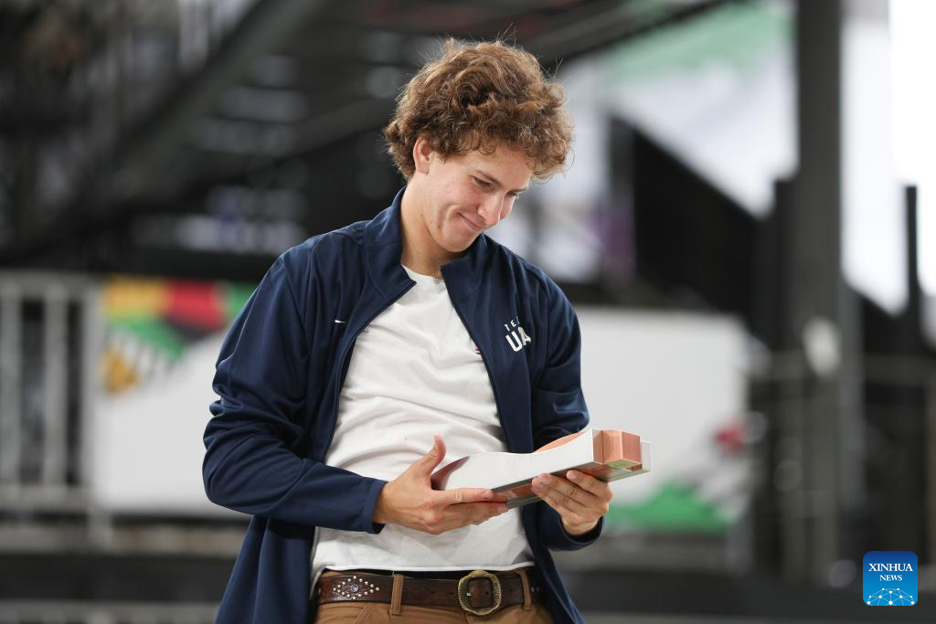 Jagger Eaton of the United States reacts during the awarding ceremony of the men's park final of skateboarding at the Olympic Qualifier Series Shanghai in east China's Shanghai, May 19, 2024. (Xinhua/Xu Yanan)