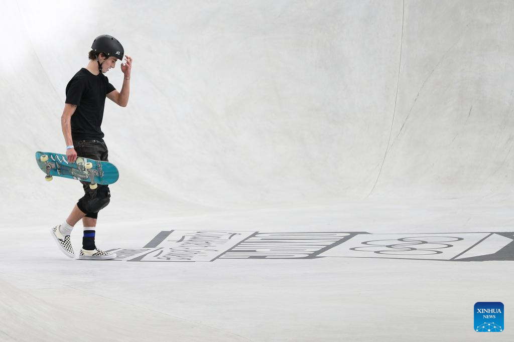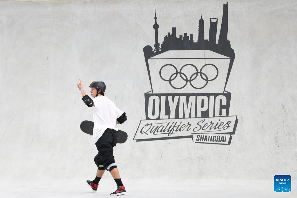 Luigi Cini of Brazil gestures during the men's park final of skateboarding at the Olympic Qualifier Series Shanghai in east China's Shanghai, May 19, 2024. (Xinhua/Xu Yanan)