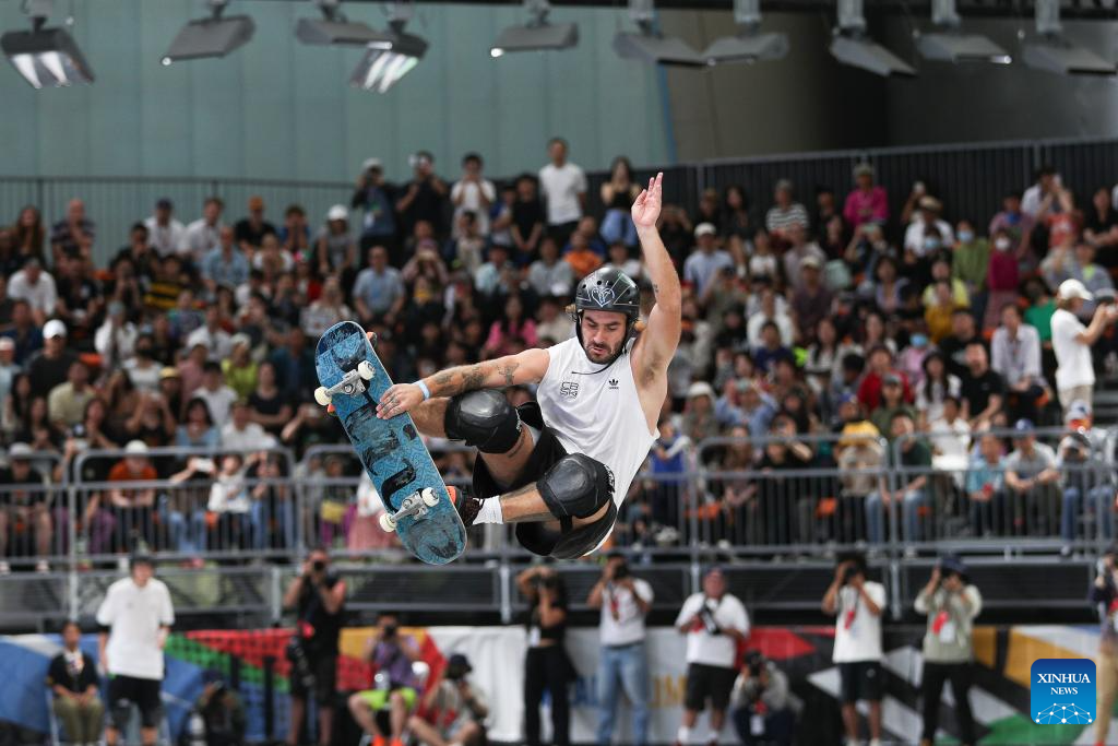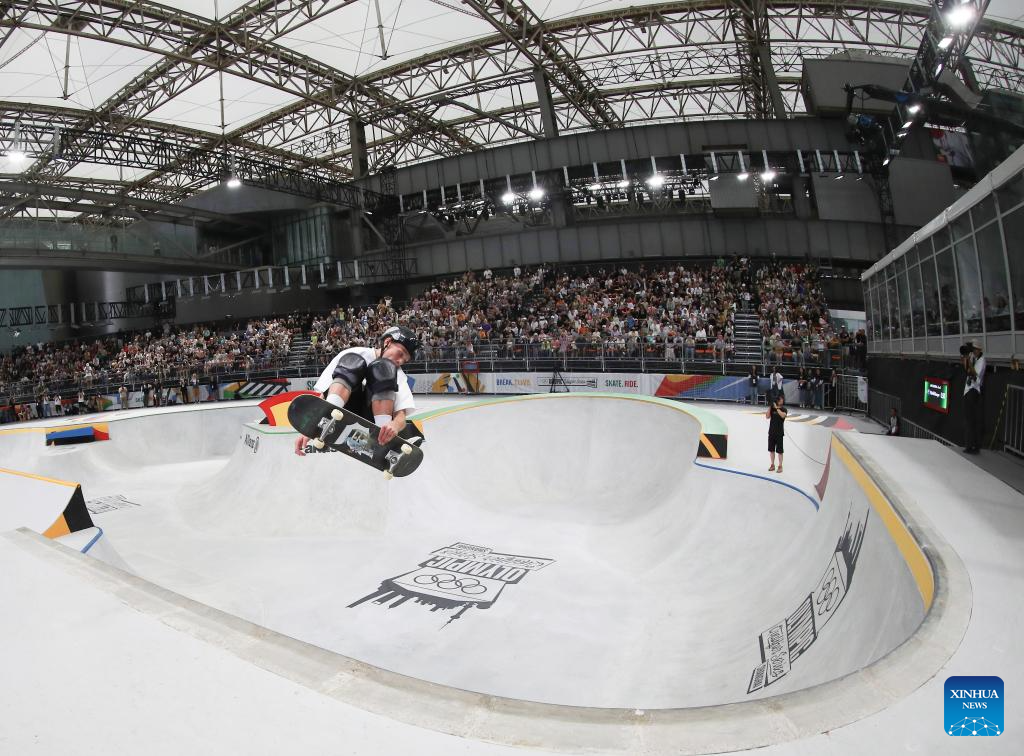 Pedro Barros of Brazil competes during the men's park final of skateboarding at the Olympic Qualifier Series Shanghai in east China's Shanghai, May 19, 2024. (Xinhua/Xu Yanan)