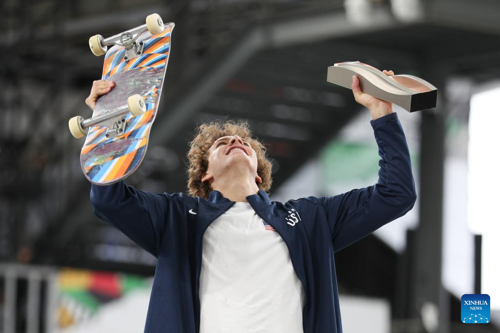 Jagger Eaton of the United States celebrates during the awarding ceremony of the men's park final of skateboarding at the Olympic Qualifier Series Shanghai in east China's Shanghai, May 19, 2024. (Xinhua/Xu Yanan)
