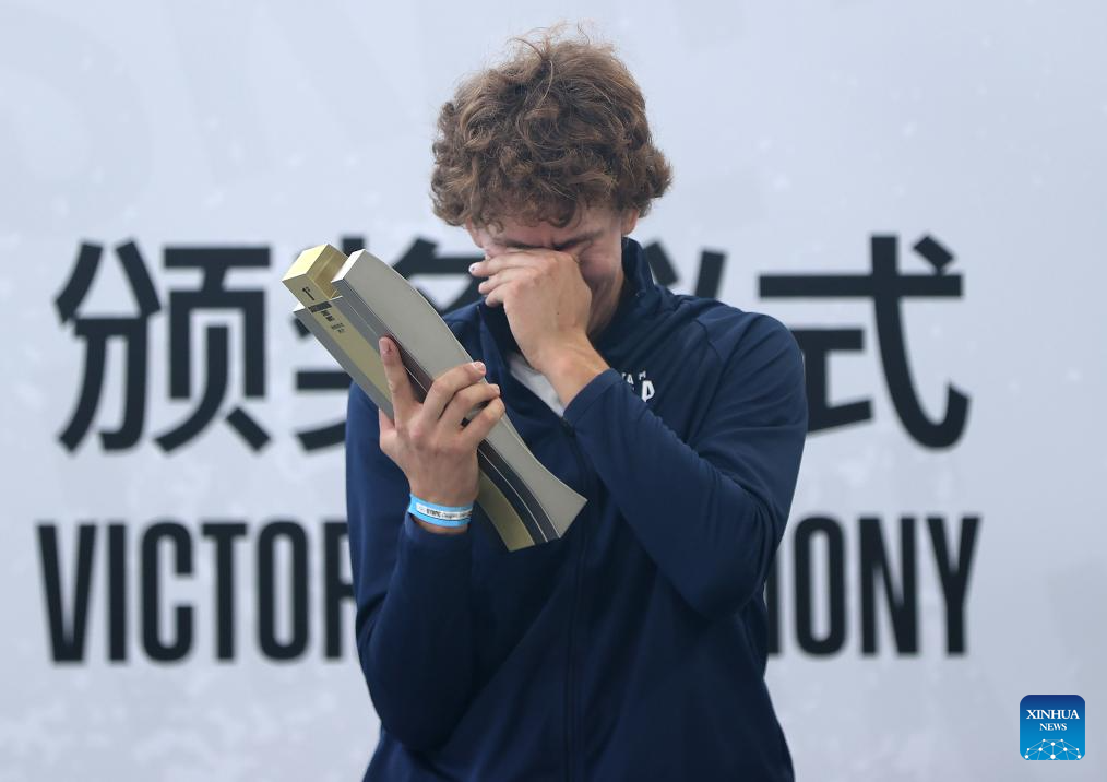 Jagger Eaton of the United States reacts during the awarding ceremony of the men's street final of skateboarding at the Olympic Qualifier Series Shanghai in east China's Shanghai, May 19, 2024. (Xinhua/Jia Haocheng)