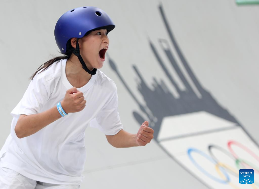 Onodera Ginwoo of Japan celebrates during the men's street final of skateboarding at the Olympic Qualifier Series Shanghai in east China's Shanghai, May 19, 2024. (Xinhua/Jia Haocheng)