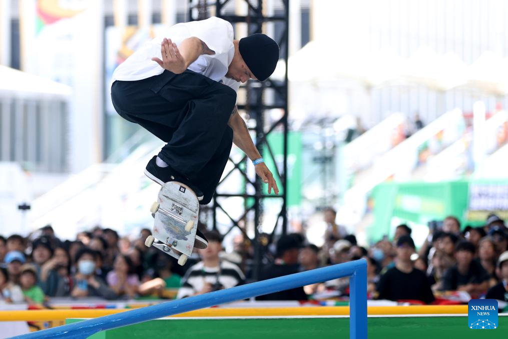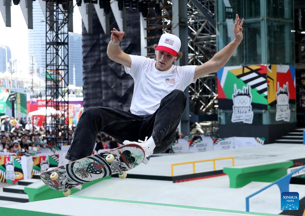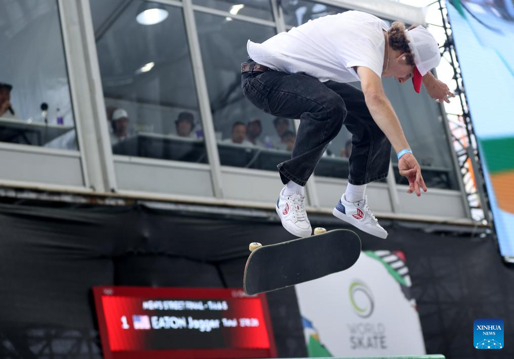 Jagger Eaton of the United States competes during the men's street final of skateboarding at the Olympic Qualifier Series Shanghai in east China's Shanghai, May 19, 2024. (Xinhua/Jia Haocheng)
