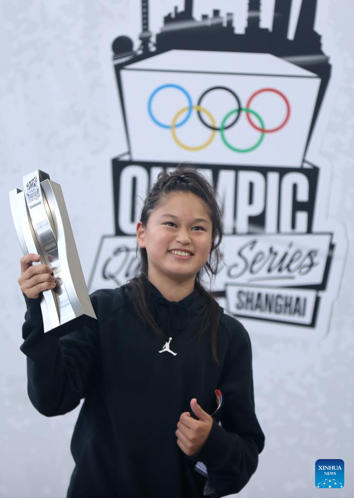 Onodera Ginwoo of Japan reacts during the awarding ceremony of the men's street final of skateboarding at the Olympic Qualifier Series Shanghai in east China's Shanghai, May 19, 2024. (Xinhua/Jia Haocheng)