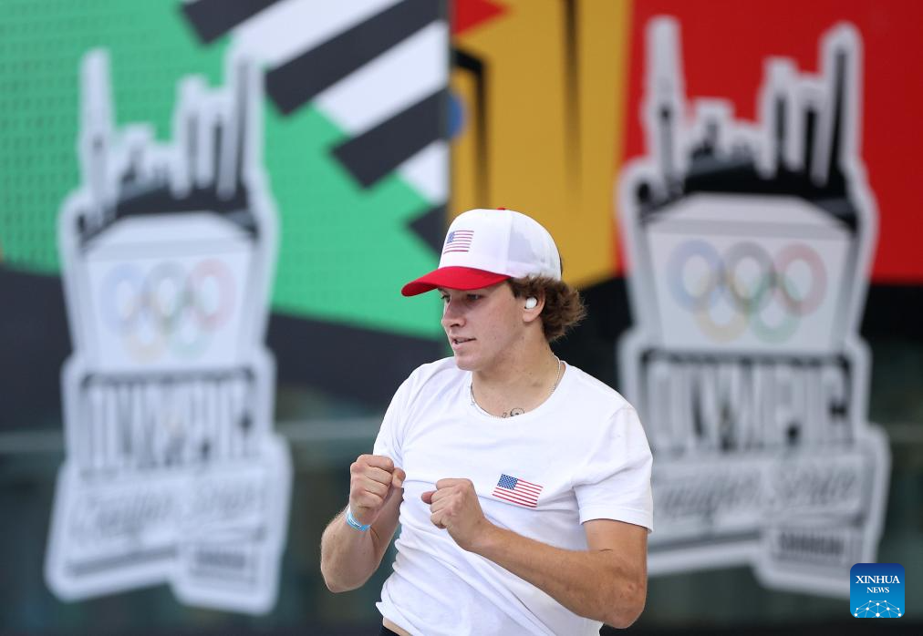 Jagger Eaton of the United States reacts during the men's street final of skateboarding at the Olympic Qualifier Series Shanghai in east China's Shanghai, May 19, 2024. (Xinhua/Jia Haocheng)