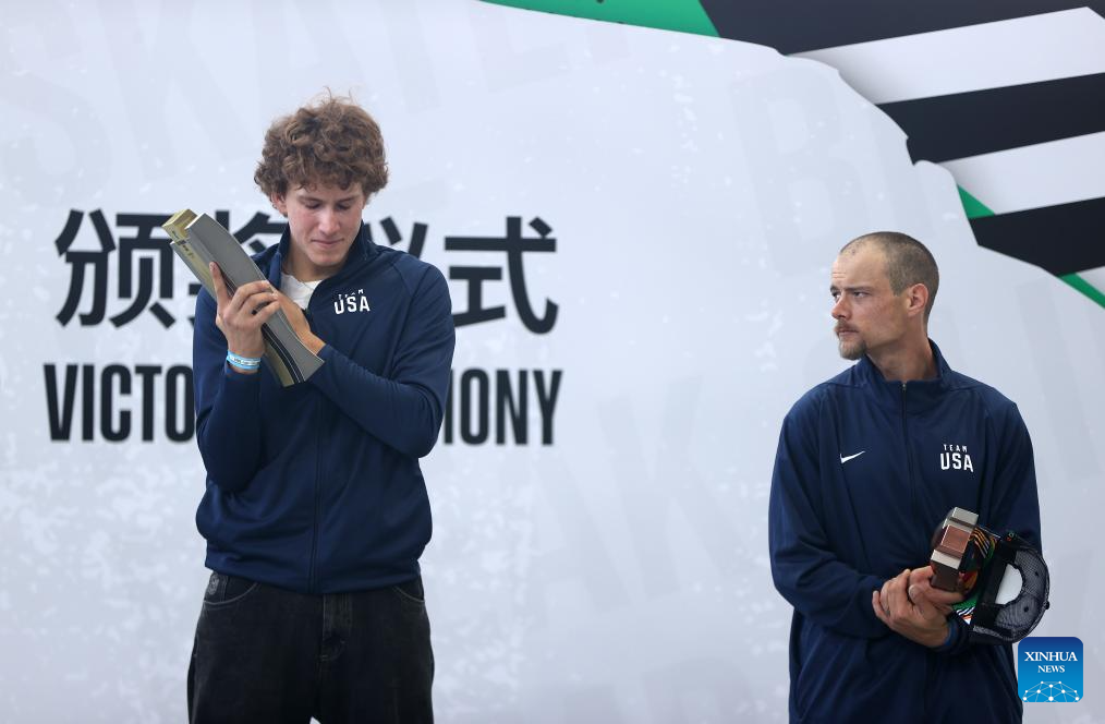 Jagger Eaton (L) of the United States reacts during the awarding ceremony of the men's street final of skateboarding at the Olympic Qualifier Series Shanghai in east China's Shanghai, May 19, 2024. (Xinhua/Jia Haocheng)