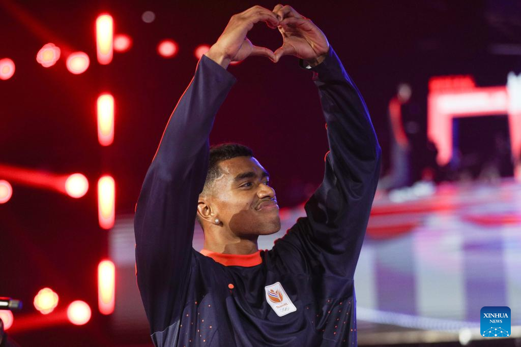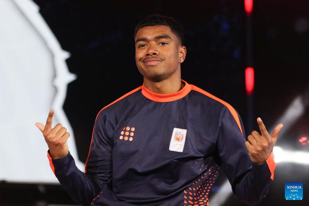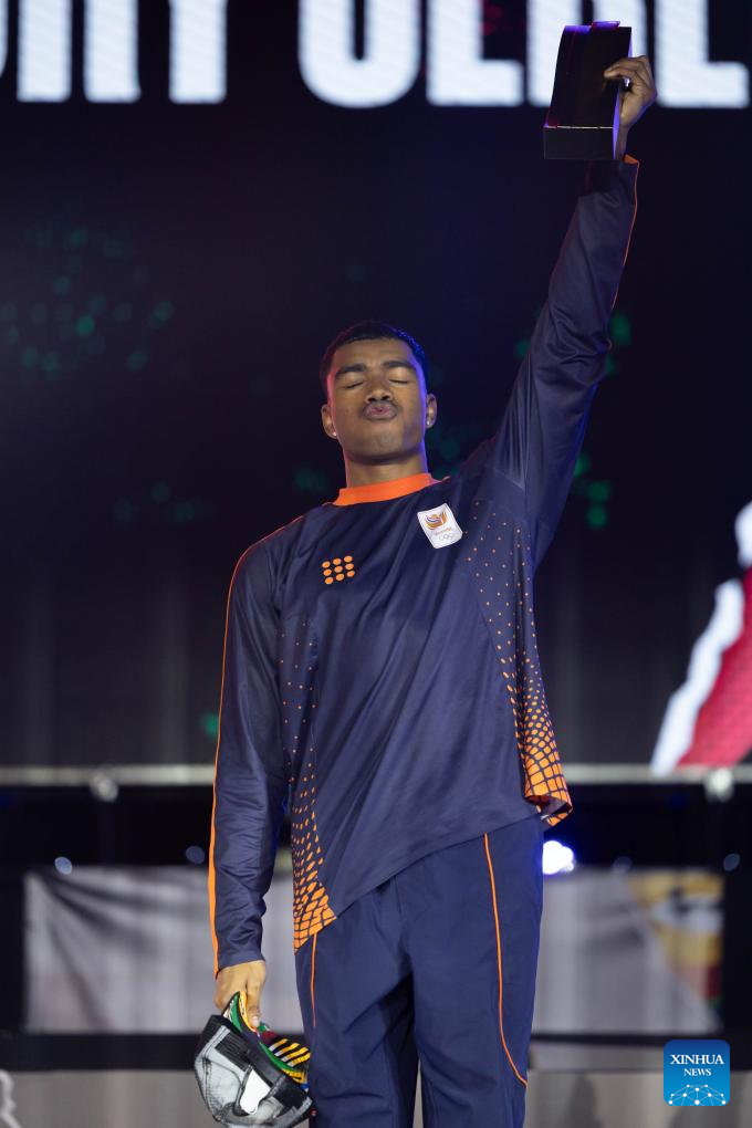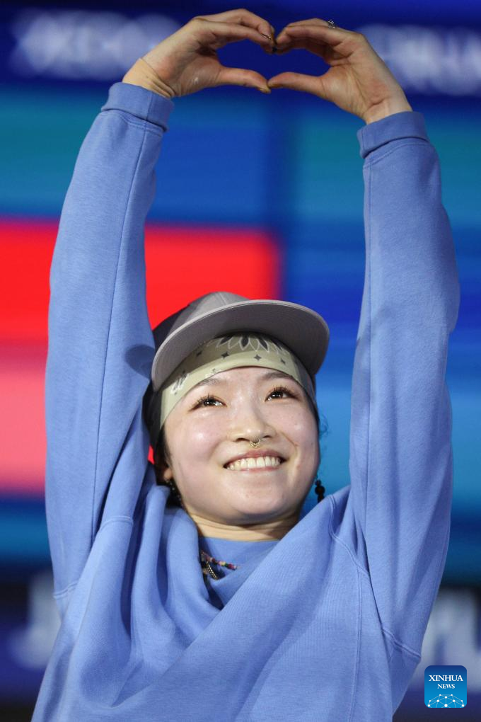 Lee-Lou Diouf Demierre of the Netherlands celebrates during the awarding ceremony of the B-boys finals of breaking event at the Olympic Qualifier Series in east China's Shanghai, May 19, 2024. (Xinhua/Wang Xiang)