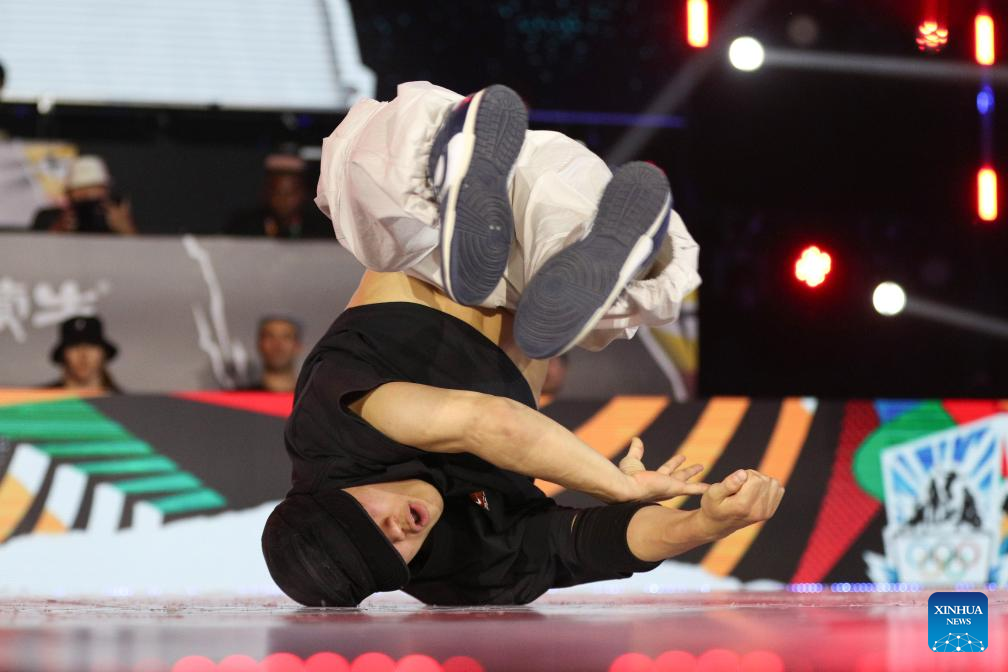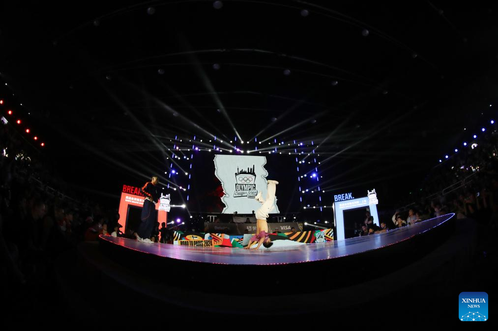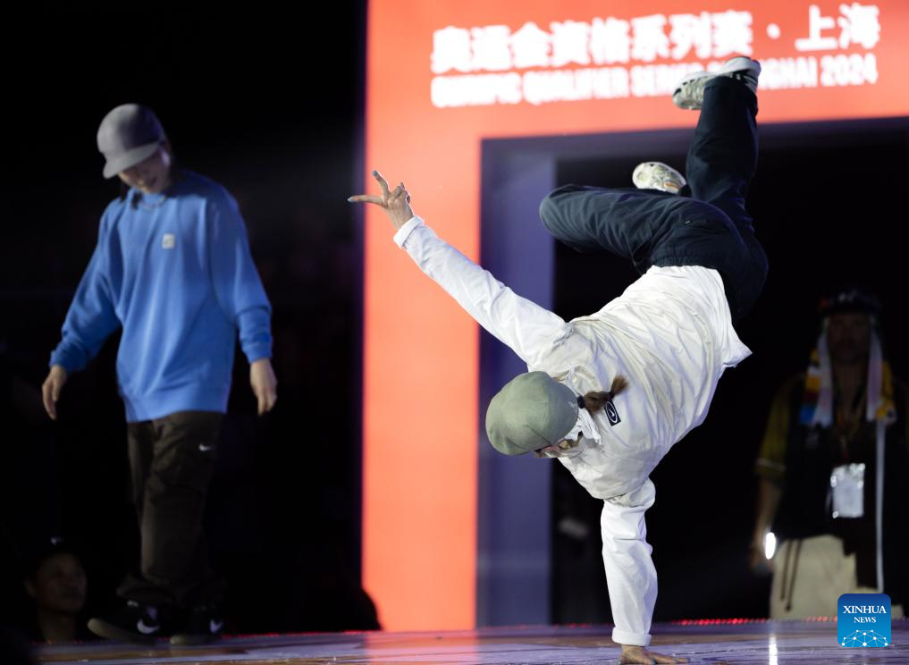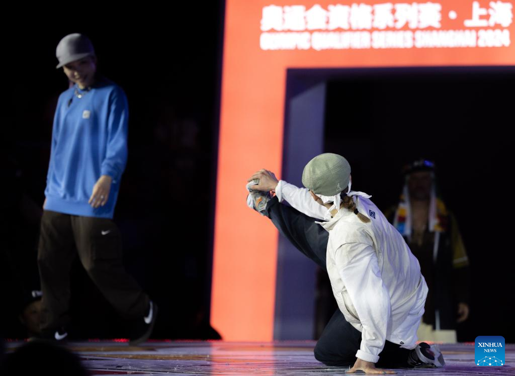 Qi Xiangyu of China competes against Lee-Lou Diouf Demierre of the Netherlands during the B-boys battle for first place of breaking event at the Olympic Qualifier Series in east China's Shanghai, May 19, 2024. (Xinhua/Wang Xiang)