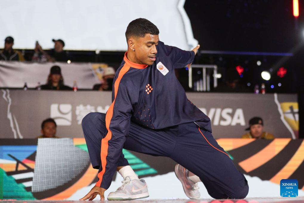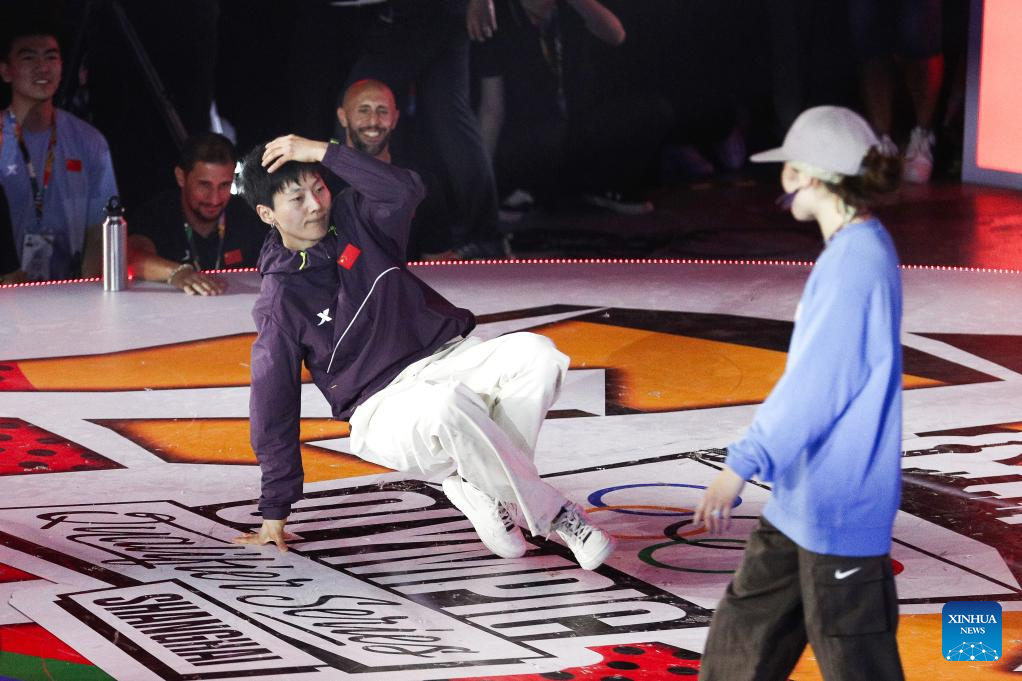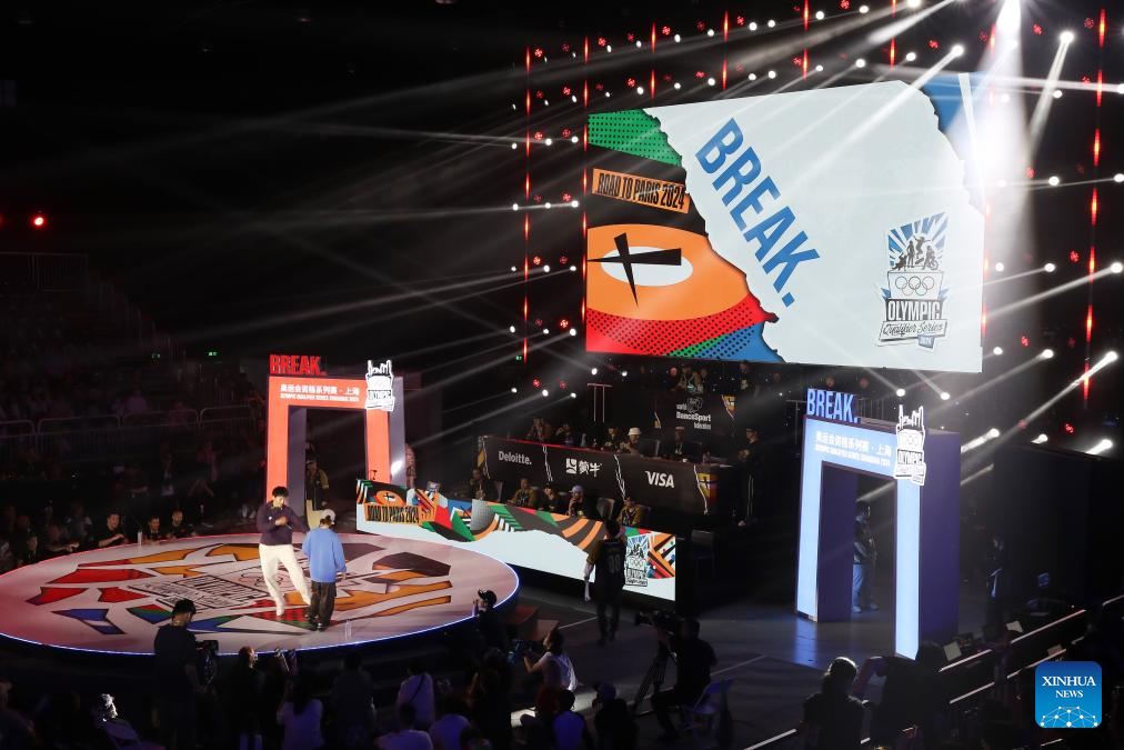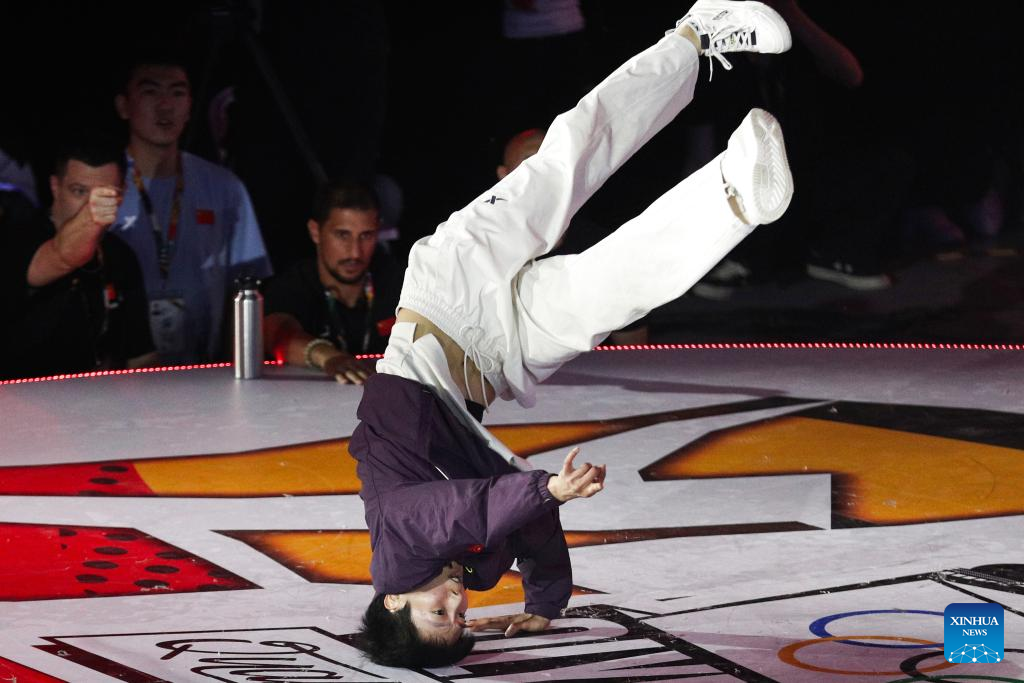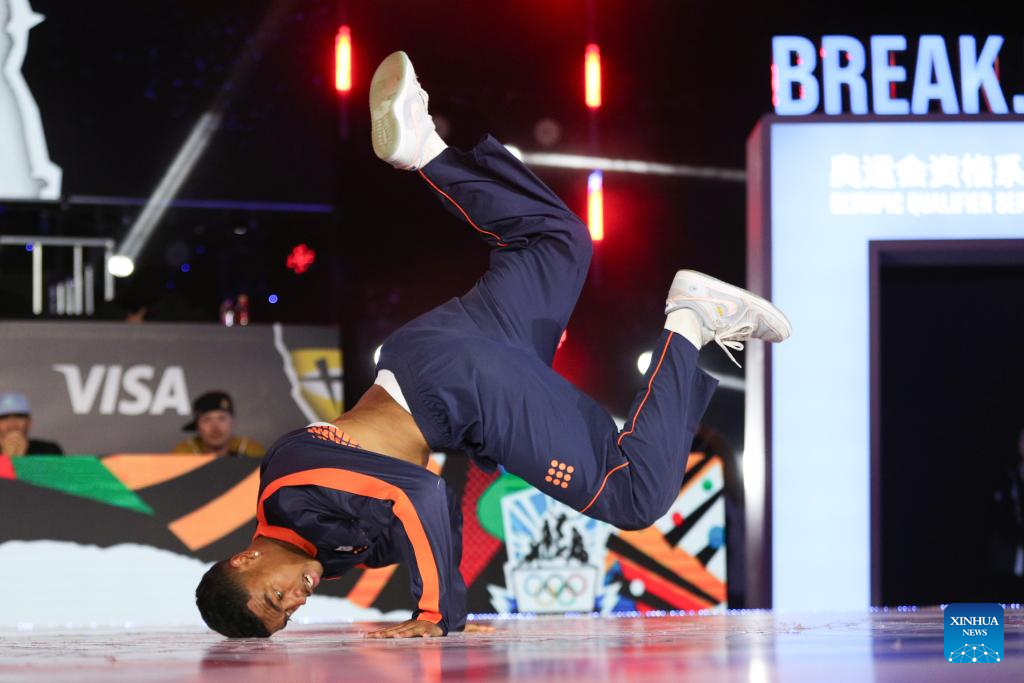Qi Xiangyu of China competes against Lee-Lou Diouf Demierre of the Netherlands during the B-boys battle for first place of breaking event at the Olympic Qualifier Series in east China's Shanghai, May 19, 2024. (Xinhua/Wang Xiang)