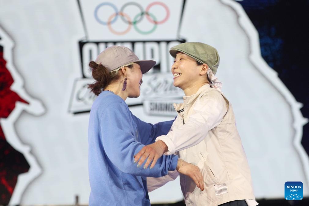 Yuasa Ami (L) of Japan hugs Fukushima Ayumi of Japan after the B-Girls Battle for First Place of breaking at the Olympic Qualifier Series Shanghai in east China's Shanghai, May 19, 2024. (Xinhua/Xu Yanan)