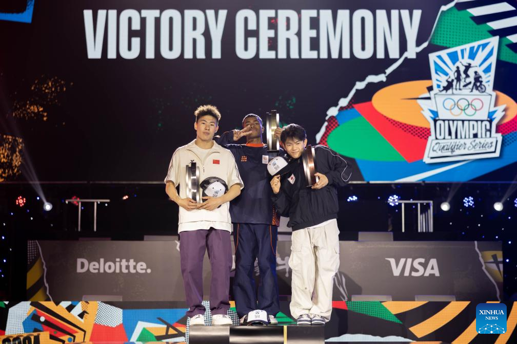 (L-R) Qi Xiangyu of China, Lee-Lou Diouf Demierre of the Netherlands and Ono Hiroto of Japan pose for photograph during the awarding ceremony of the B-boys finals of breaking event at the Olympic Qualifier Series in east China's Shanghai, May 19, 2024. (Xinhua/Wang Xiang)
