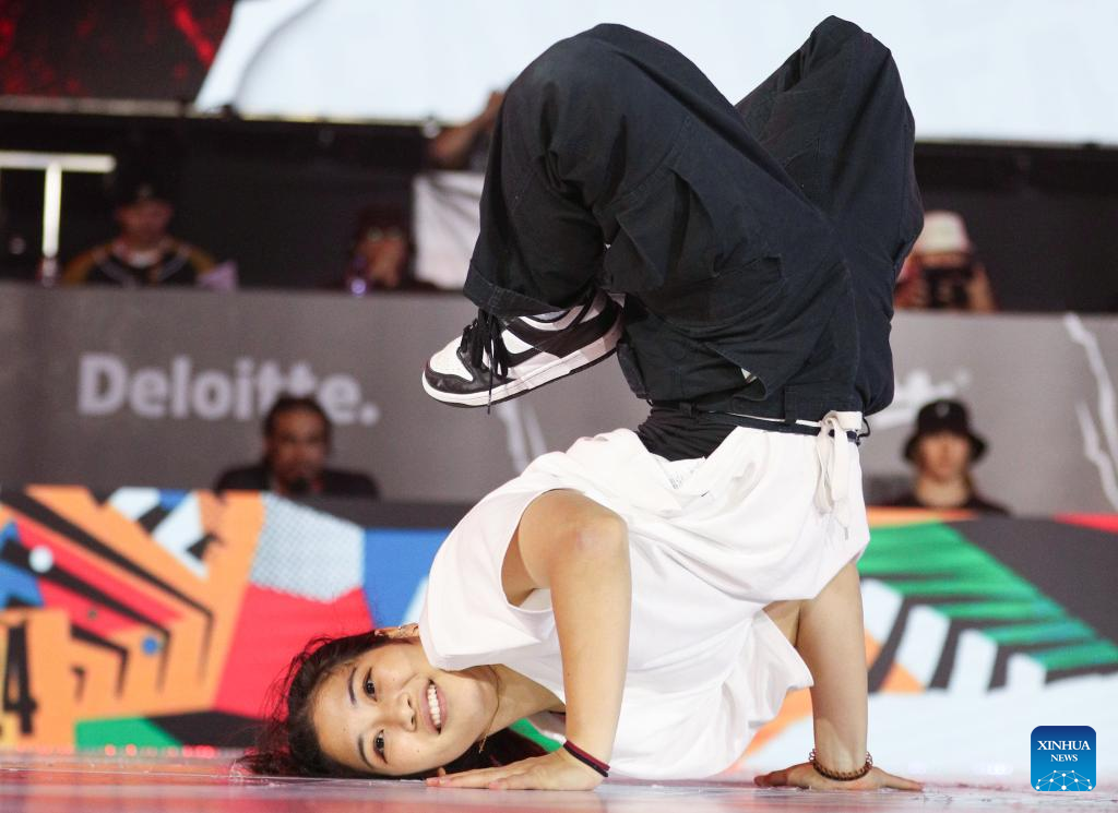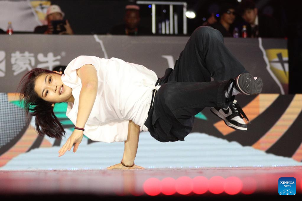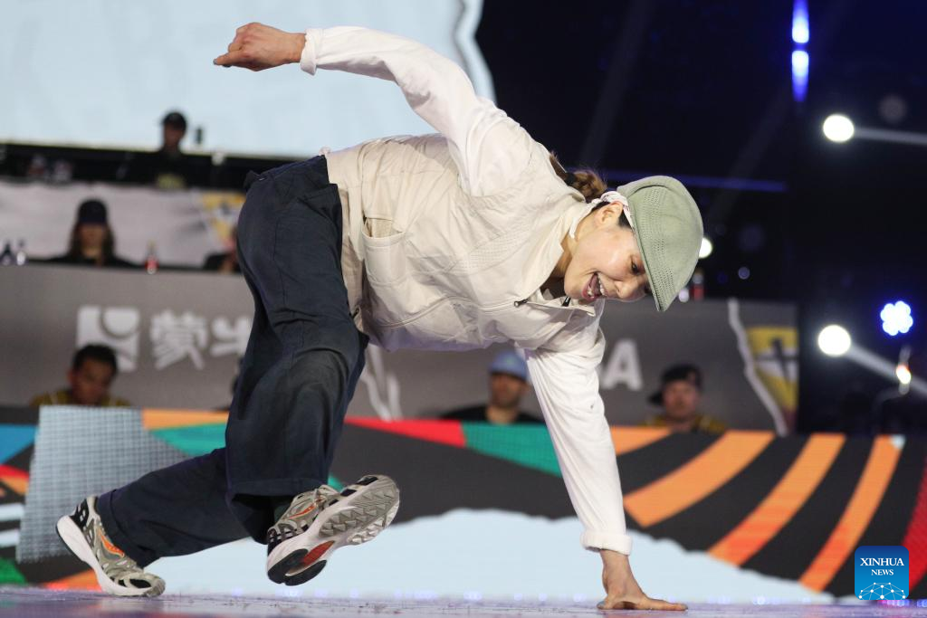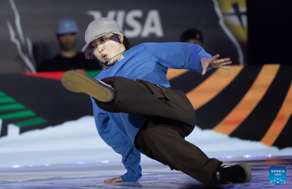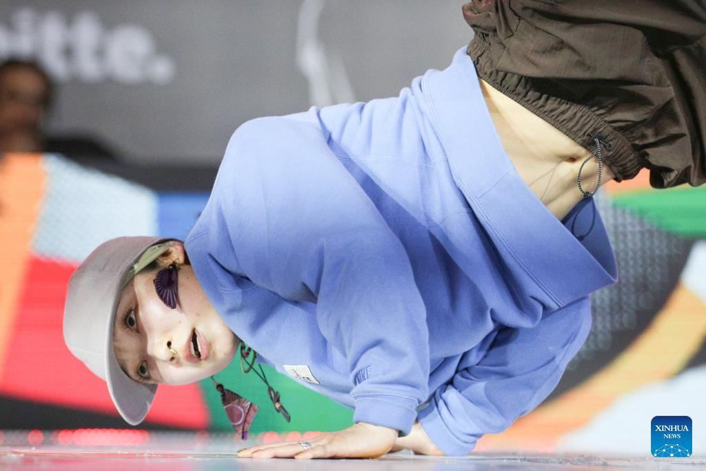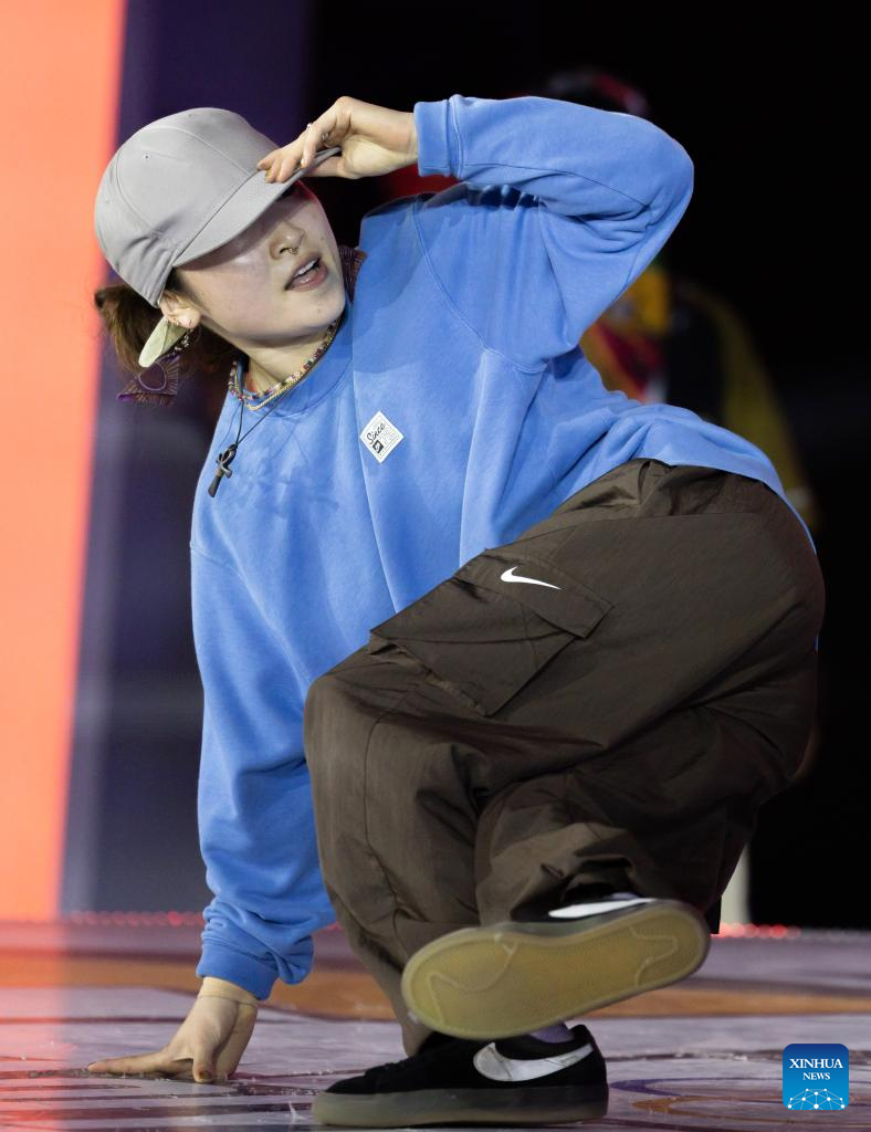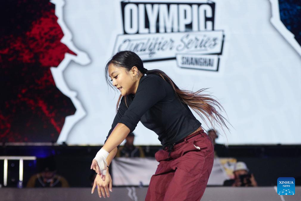 Yuasa Ami of Japan competes during the B-Girls Battle for First Place of breaking at the Olympic Qualifier Series Shanghai in east China's Shanghai, May 19, 2024. (Xinhua/Xu Yanan)