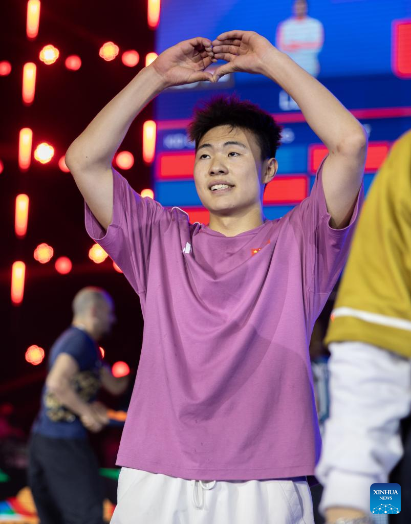 Qi Xiangyu of China greets spectators after the B-boys battle for first place against Lee-Lou Diouf Demierre of the Netherlands of breaking event at the Olympic Qualifier Series in east China's Shanghai, May 19, 2024. (Xinhua/Wang Xiang)