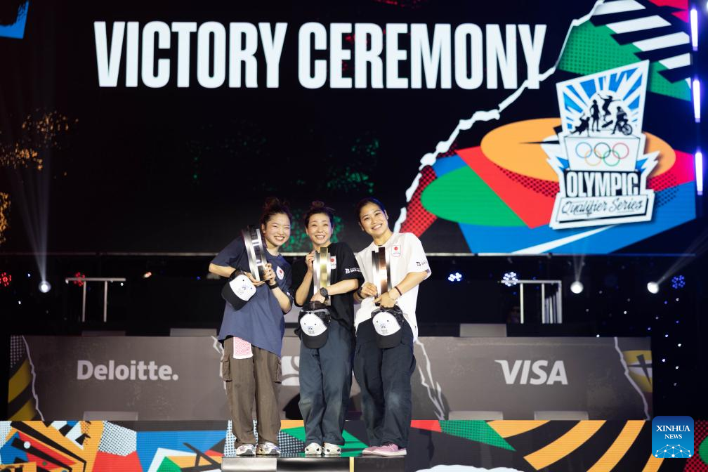 Japan's Fukushima Ayumi, Yuasa Ami and Tsuhako Riko (L to R) pose for photos at the awarding ceremony of B-Girls breaking at the Olympic Qualifier Series Shanghai in east China's Shanghai, May 19, 2024. (Xinhua/Wang Xiang)