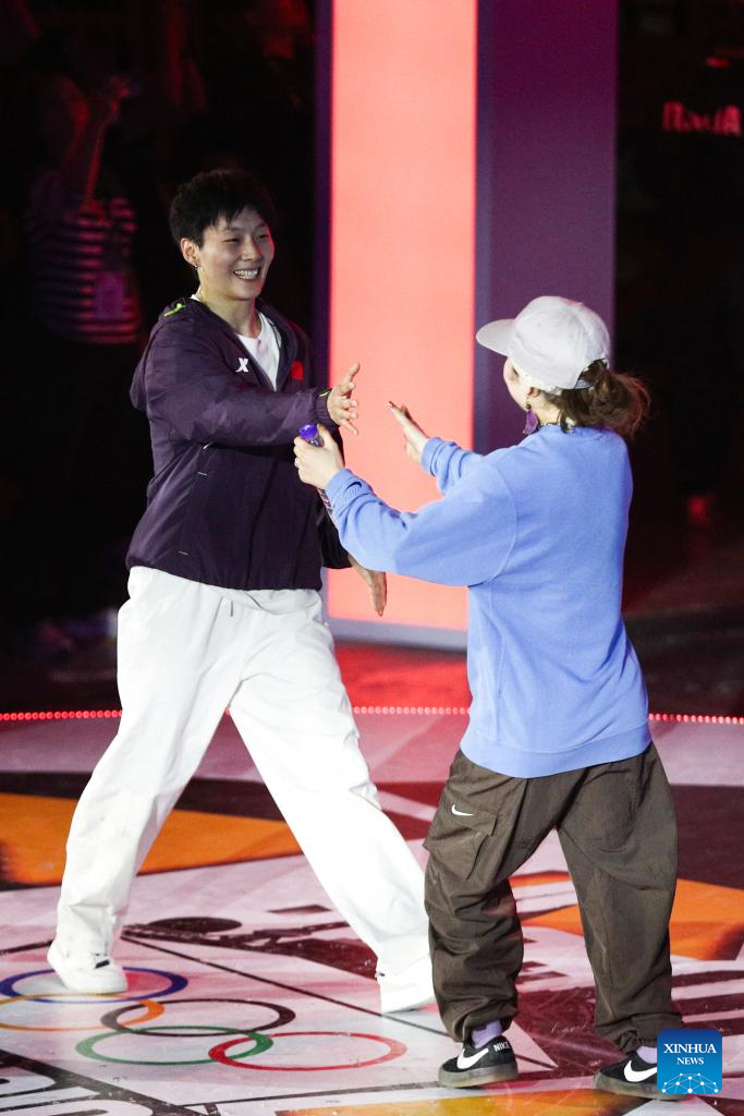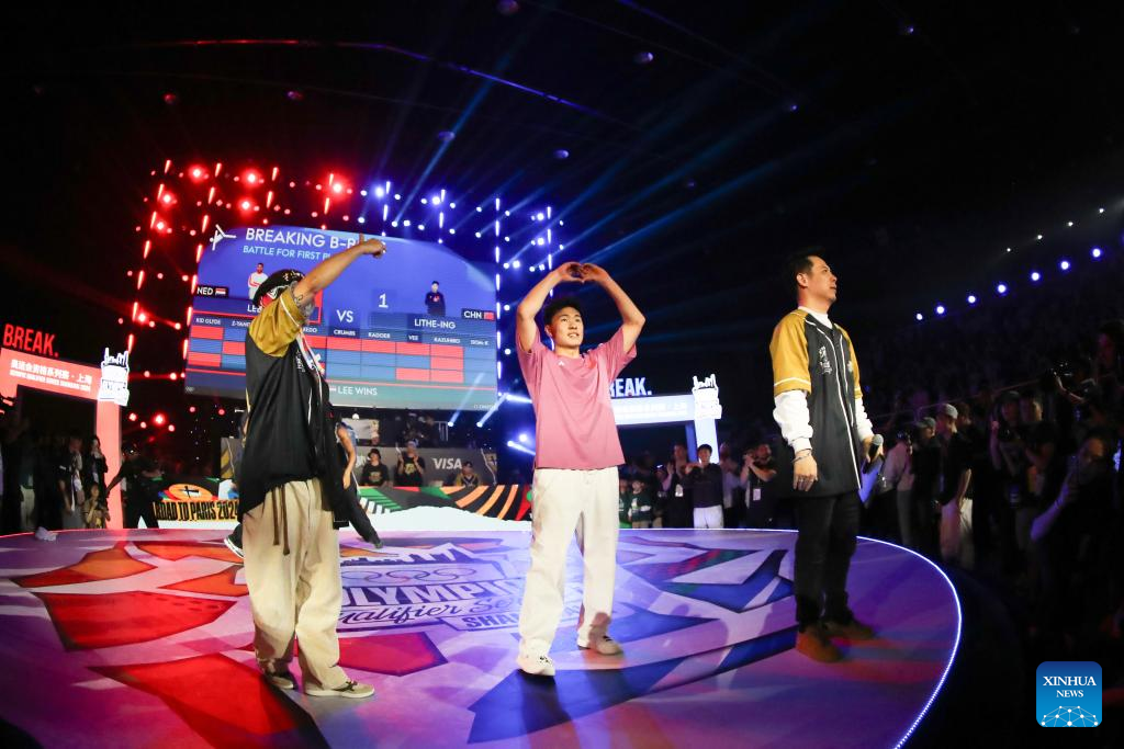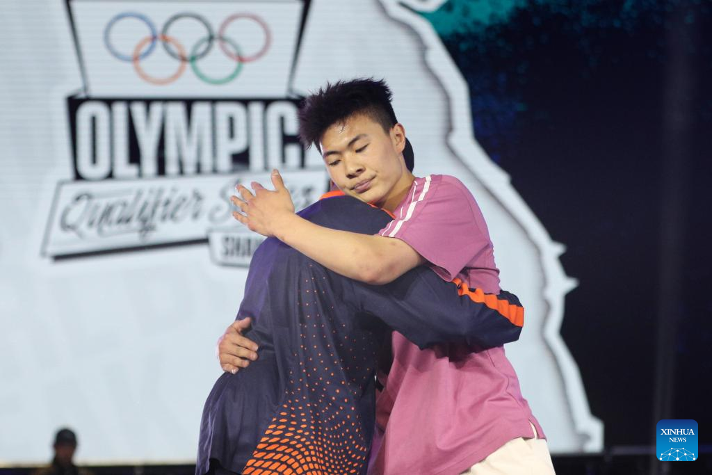 Qi Xiangyu (C) of China greets spectators after the B-boys battle for first place against Lee-Lou Diouf Demierre of the Netherlands of breaking event at the Olympic Qualifier Series in east China's Shanghai, May 19, 2024. (Xinhua/Xu Yanan)