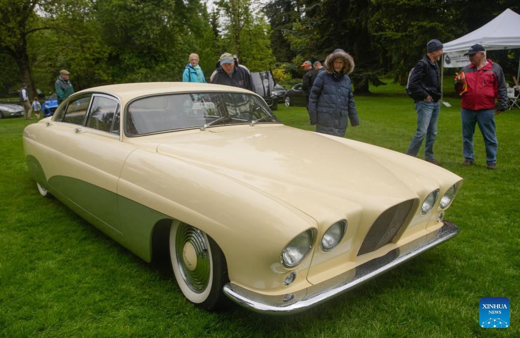 People view classic cars displayed during the 37th Vancouver All British Field Meet classic car show at VanDusen Botanical Garden in Vancouver, British Columbia, Canada, on May 18, 2024. The event showcased more than 500 British classic cars, bringing together car owners and enthusiasts to share their stories. (Photo by Liang Sen/Xinhua)