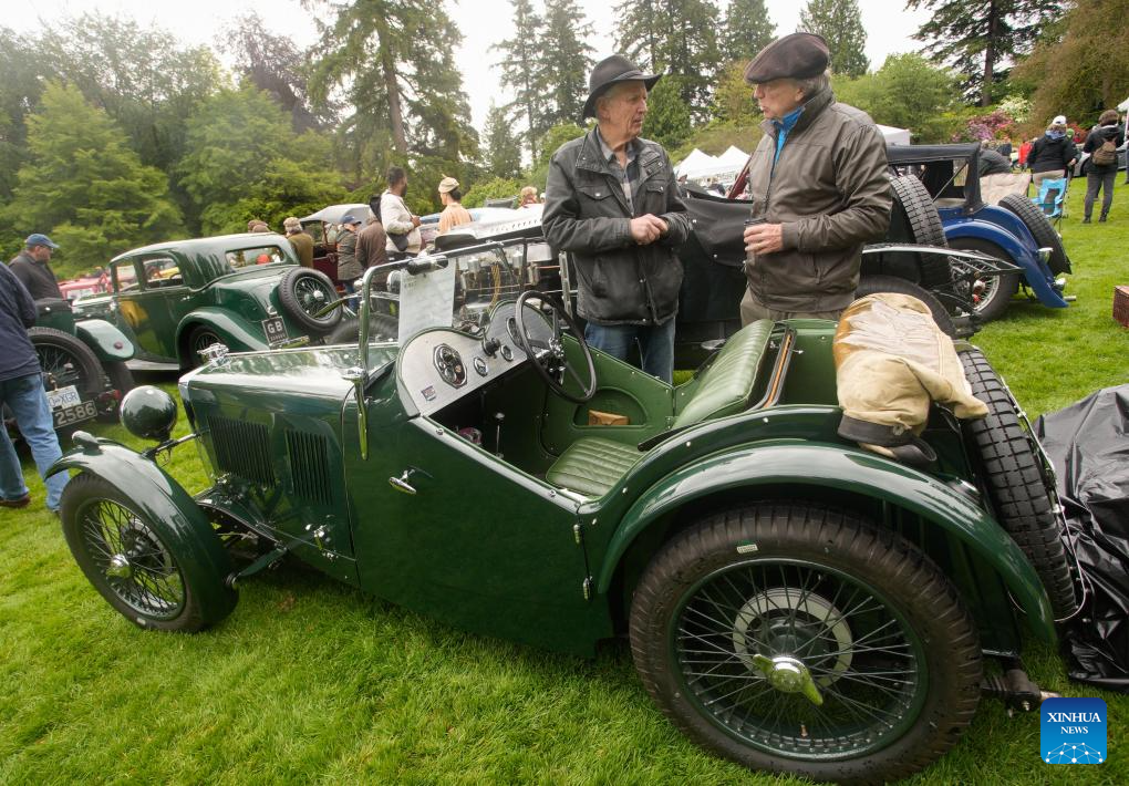 People visit the 37th Vancouver All British Field Meet classic car show at VanDusen Botanical Garden in Vancouver, British Columbia, Canada, on May 18, 2024. The event showcased more than 500 British classic cars, bringing together car owners and enthusiasts to share their stories. (Photo by Liang Sen/Xinhua)