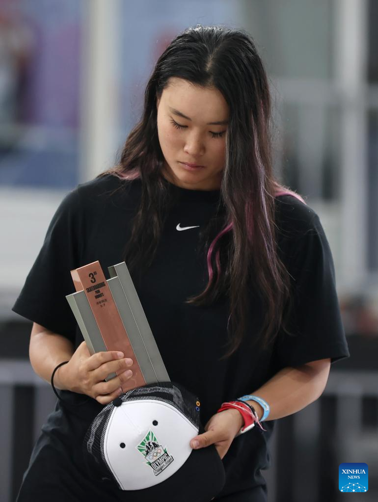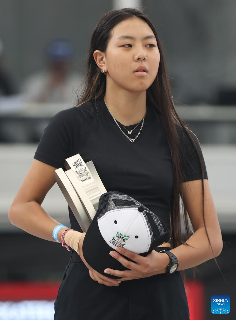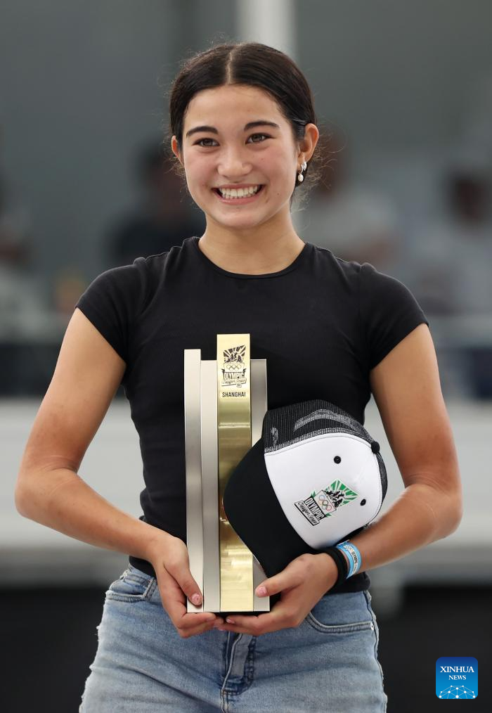 Arisa Trew of Australia reacts during the awarding ceremony of the women's park final of skateboarding at the Olympic Qualifier Series Shanghai in east China's Shanghai, May 19, 2024. (Xinhua/Jia Haocheng)