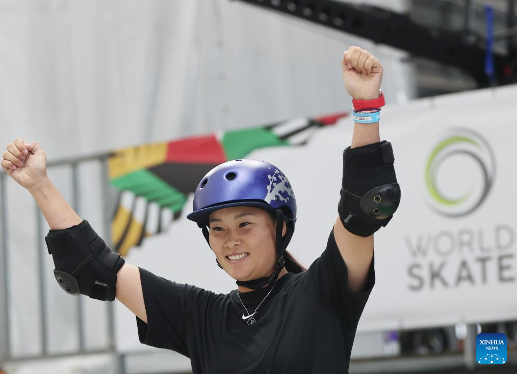 Isadora Pacheco of Brazil competes during the women's park final of skateboarding at the Olympic Qualifier Series Shanghai in east China's Shanghai, May 19, 2024. (Xinhua/Jia Haocheng)