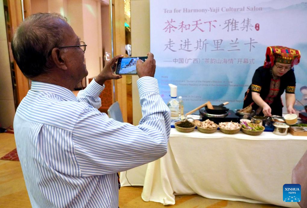 A man takes photos of the making of Youcha, or oil tea, of the Yao ethnic group during an event titled "Tea for Harmony: Yaji Cultural Salon and Guangxi Cultural and Tourism Promotion" in Colombo, Sri Lanka, May 21, 2024. Local Chinese tea lovers had an immersive experience of tea cultures during a celebration of the International Tea Day here on Tuesday. (Xinhua/Wu Yue)