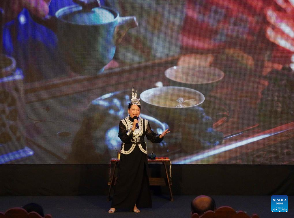A singer performs during an event titled "Tea for Harmony: Yaji Cultural Salon and Guangxi Cultural and Tourism Promotion" in Colombo, Sri Lanka, May 21, 2024. Local Chinese tea lovers had an immersive experience of tea cultures during a celebration of the International Tea Day here on Tuesday. (Xinhua/Wu Yue)