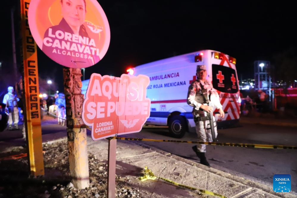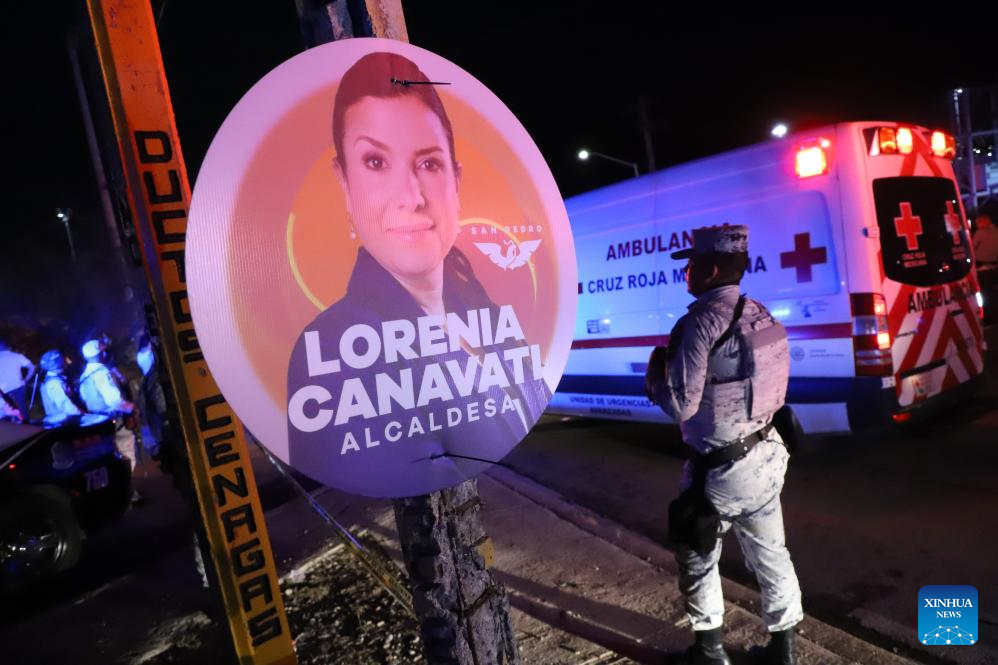 A security staff member stands guard at the scene of a campaign stage collapse in the state of Nuevo Leon, Mexico, on May 22, 2024. At least nine people died after a structure collapsed during a political event on Wednesday evening where Mexico's presidential candidate, Jorge Alvarez Maynez, was present in the northern state of Nuevo Leon, local media reported. (Xinhua)