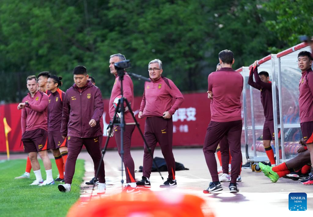 Branko Ivankovic (C), head coach of the Chinese men's national football team, looks on during a training session in preparation for the upcoming 2026 FIFA World Cup Asian qualifiers match in Shenyang, northeast China's Liaoning Province, May 27, 2024. (Xinhua/Zhang Lei)