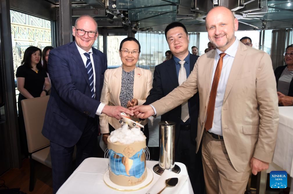 Photo taken on May 29, 2024 shows a celebration for the resumption of Hainan Airlines' operations in Austria in Vienna, Austria. (Xinhua/He Canling)