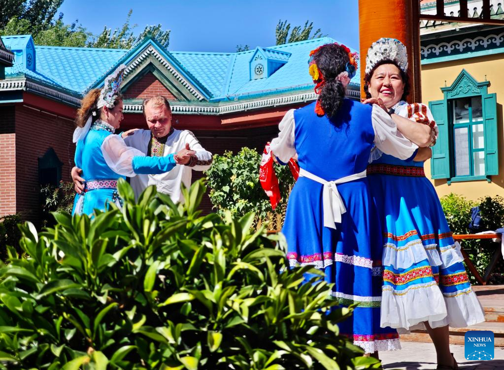 Residents of Russian ethnic group perform folk dance on Liuxing Street in Yining City, Ili Kazak Autonomous Prefecture, northwest China's Xinjiang Uygur Autonomous Region, May 28, 2024. (Xinhua/Wang Fei)