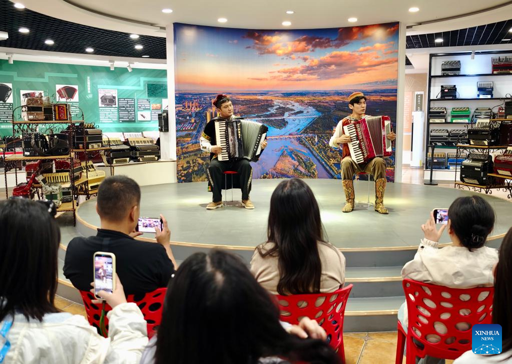 Tourists enjoy a performance at an accordion museum on Liuxing Street in Yining City, Ili Kazak Autonomous Prefecture, northwest China's Xinjiang Uygur Autonomous Region, May 28, 2024. (Xinhua/Wang Fei)