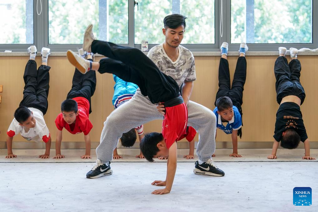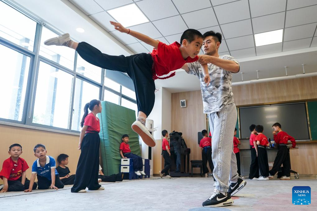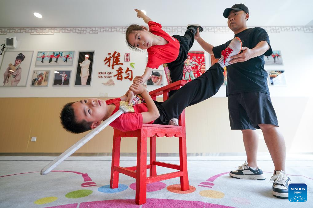 Pupils of the "little Kunqu Opera training class" practice basic skills of Kunqu Opera under the guidance of a teacher at Shipai Center Primary School of Kunshan in Kunshan City, east China's Jiangsu Province, May 26, 2024.(Xinhua/Li Bo)