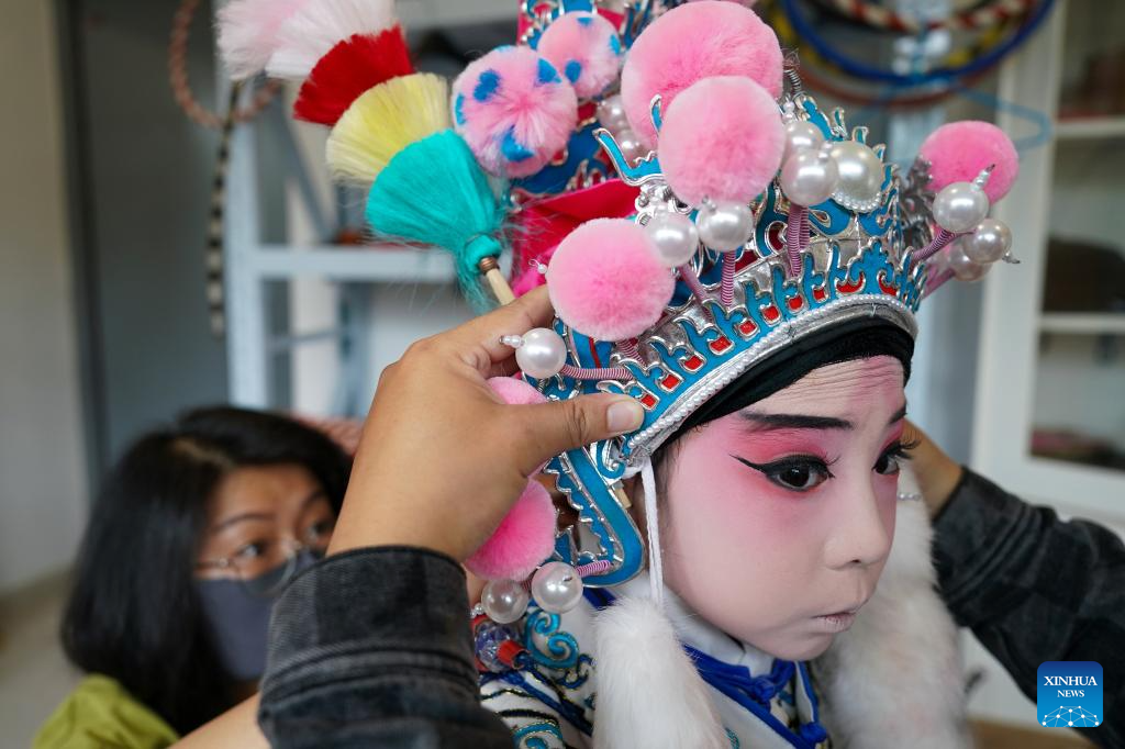 Xie Suqian, a pupil of the "little Kunqu Opera training class" of Shipai Center Primary School, prepares before a Kunqu Opera performance in Kunshan City, east China's Jiangsu Province, May 31, 2024.(Xinhua/Li Bo)