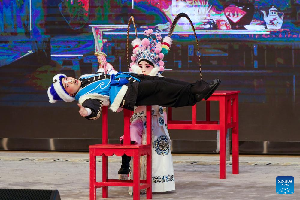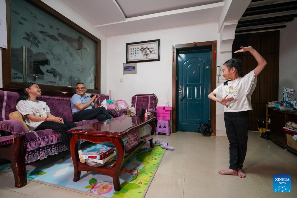 Xie Suqian (R), a pupil of the "little Kunqu Opera training class" of Shipai Center Primary School, performs Kunqu Opera for her father and sister at home in Kunshan City, east China's Jiangsu Province, May 30, 2024.(Xinhua/Li Bo)