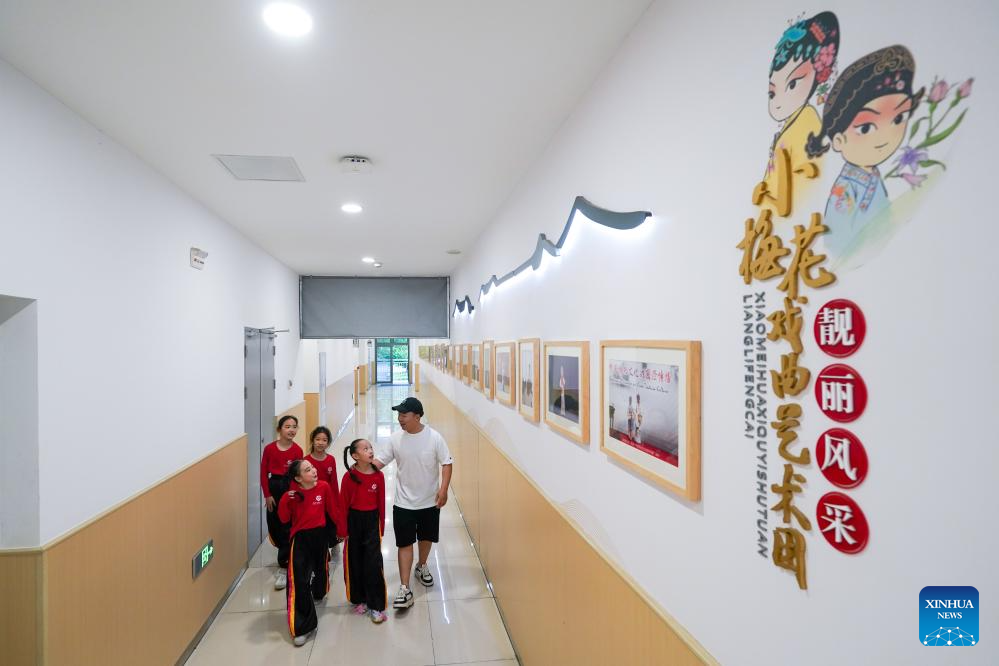 The full-time teacher Zhou Jie (1st R) and pupils of the "little Kunqu Opera training class" head for a training session at Shipai Center Primary School of Kunshan in Kunshan City, east China's Jiangsu Province, May 30, 2024.(Xinhua/Li Bo)