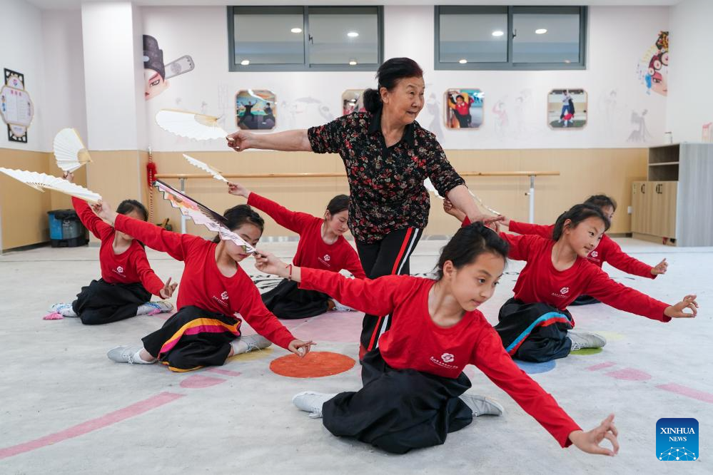 Pupils of the "little Kunqu Opera training class" practice fan dance under the guidance of teacher Wu Meiyu (C) at Shipai Center Primary School of Kunshan in Kunshan City, east China's Jiangsu Province, May 30, 2024.(Xinhua/Li Bo)