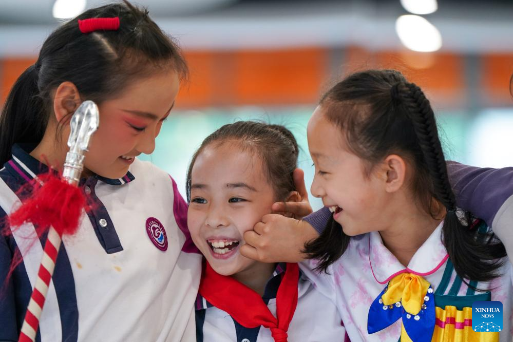 Xie Suqian (C), a pupil of the "little Kunqu Opera training class", has fun with her classmates at Shipai Center Primary School of Kunshan in Kunshan City, east China's Jiangsu Province, May 31, 2024.(Xinhua/Li Bo)